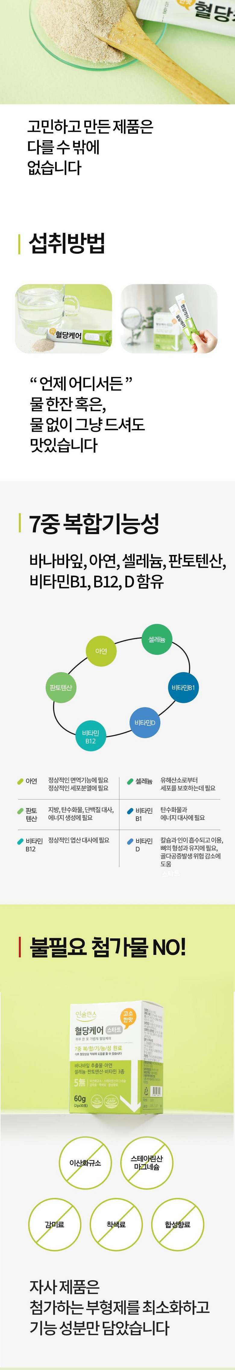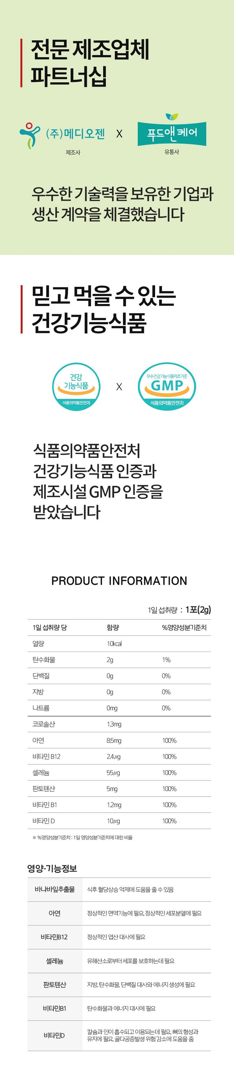 | 원료명 및 함량 | 혼합제제1(아셀렌산나트륨, 옥수수말토덱스트린), 산화아연, 판토텐산칼슘, 바나바잎추출물, 혼합제제2(비타민 B12, 말토덱스트린, 구연산삼나트륨, 구연산), 비타민 B1 염산염, 건조효모(비타민D3), 치커리식이섬유(네덜란드산), 프락토올리고당(인도산), 식물성크림[물엿, 야자경화유(외국산 : 인도네시아, 말레이시아, 필리핀 등), 카제인, 제이인산칼륨, 제삼인삼칼슘, 글리세린지방산에스테르, 폴리인산칼륨, 스테아릴젖산나트륨], 자일리톨(감미료), 캐롭추출분말[캐롭포드(튀르키예산)], 난소화성말토덱스트린, 천연향료(요구르트향), 쌀발효분말, 여주농축분말, 대나무수액추출분말, 락티스유산균-10, 귀리식이섬유, 비타민 C, 천연향료(바닐라향), 19곡혼합추출분말, 효소처리스테비아(감미료), 건조효모, 유산균혼합분말[덱스트린, 유산균혼합분말(Lacticaseibacillus paracasei MG5012, Lactiplantibacillus plantarum MG4229)], 17종혼합유산균배양건조물, 당화균(B.subtilis), 김치유산균추출분말 | 영양정보 | 1일 섭취량 당 함량% 영양성분기준치 : 열량 10kcal / 탄수화물 2g 1% / 단백질 0g 0% / 지방 0g 0% / 나트륨 0mg 0% / 코로솔산 1.3mg / 아연 8,5mg 100% / 비타민 B12 2.4μg 100% / 셀레늄 55μg 100% / 판토텐산 5mg 100% / 비타민 B1 1.2mg 100% / 비타민 D 10μg 100% |