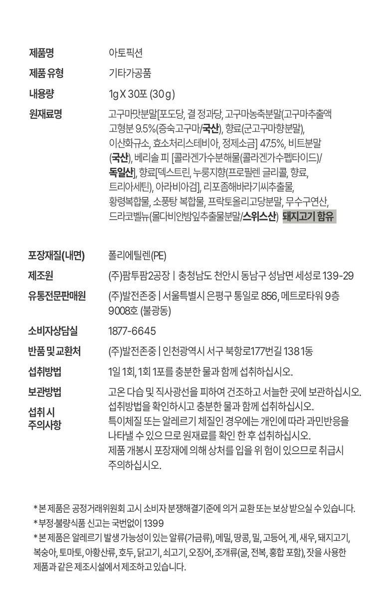 | 제조연월일, 소비기한 또는 품질유지기한 | 상품 상세페이지 참조 | 세부 품목군별 표시사항 | 상품 상세페이지 참조 |
