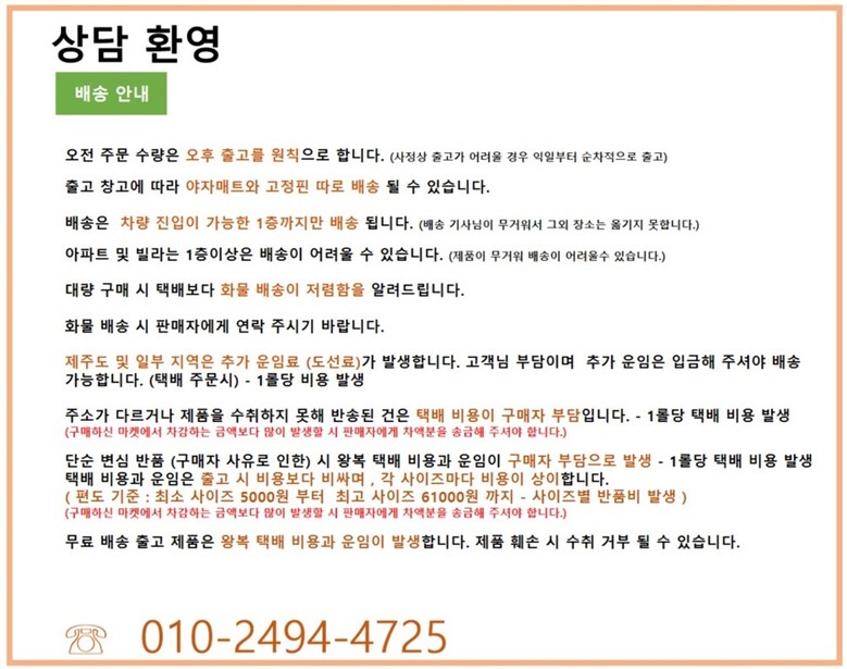 - ㆍ모니터 해상도의 차이로 인해 색상이나 이미지가 실제와 달라, 고객이 단순 변심으로 교환/반품을 무료로 요청하는 경우