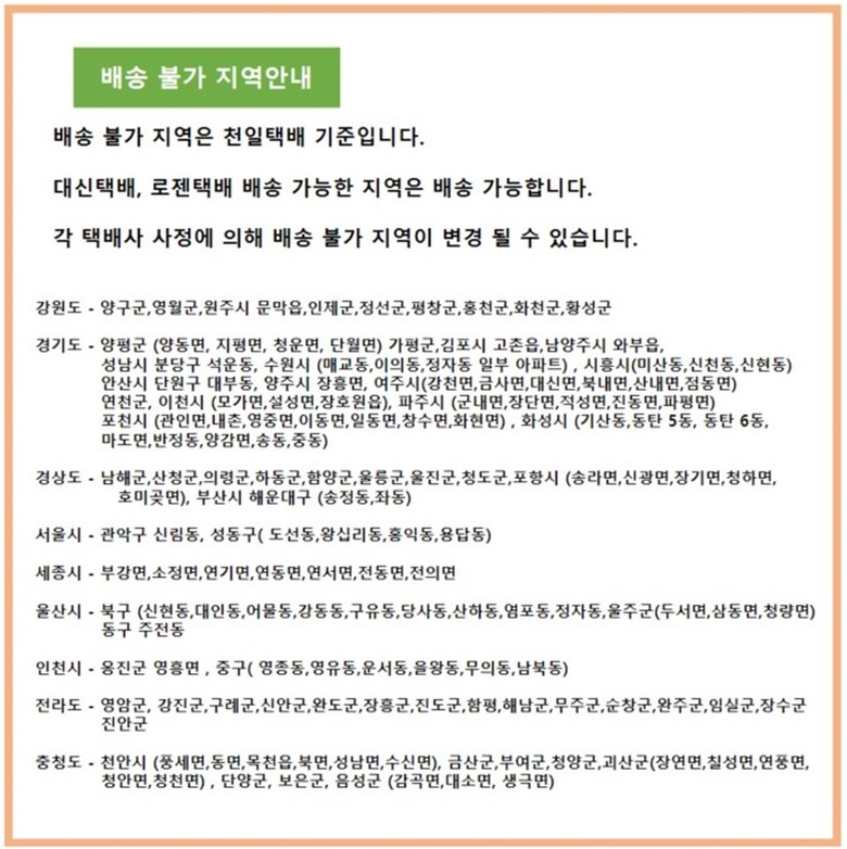 | 배송방법 | 순차배송 | 배송비 | 무료배송 - 도서산간 지역 배송불가 |