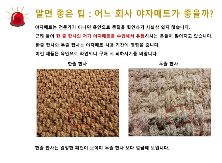 | 품명 및 모델명 | 친환경 두줄합사 야자매트 | 인증/허가 사항 | 해당 사항 없음 |