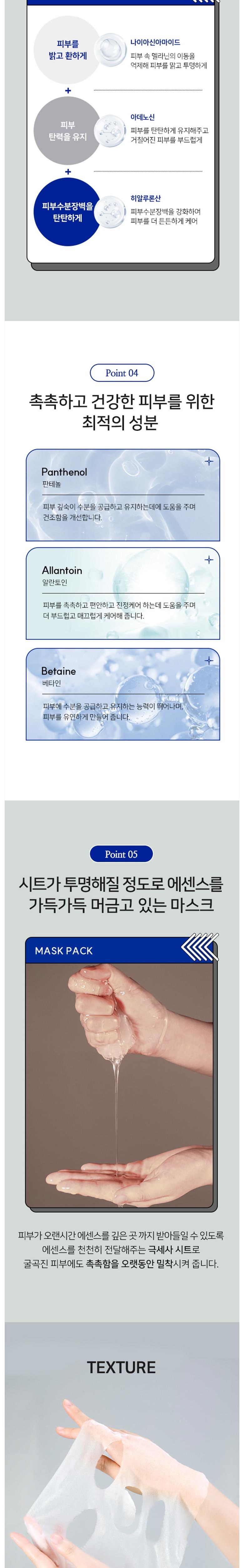 | 사용기한 또는 개봉 후 사용기간 | 제조일부터 36개월,개봉 후 즉시 사용 | 사용방법 | 시트를 꺼내어 눈과 입 주위를 제외한 얼굴 전체에 고르게 밀착시켜 10-20분 후 시트를 제거해 남은 에센스를 두들겨 흡수시켜줍니다. |