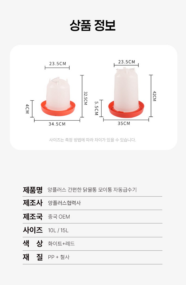 | 품명 및 모델명 | 앙플러스 간편한 닭물통 자동급수기 병아리 물통 모이통 사료통 | 인증/허가 사항 | 해당사항없음 |