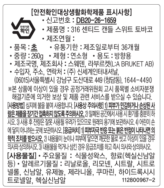 | 품목 및 제품명 | 초 / 316 센티드 캔들 스위트 토바코 | 용도(표백제의 경우 계열을 함께표시) 및 제형 | 방향용 / 연소형 |