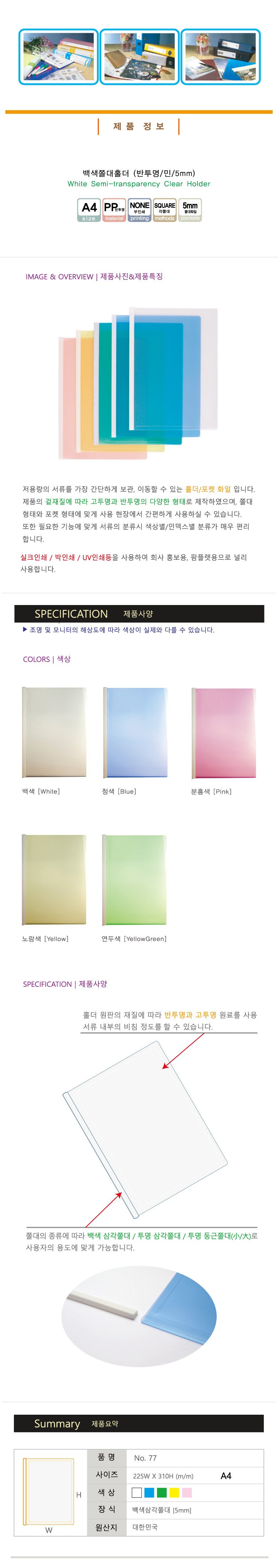 현풍 세로형 반투명 민 쫄대화일 A4 5mm, 백색, 60개