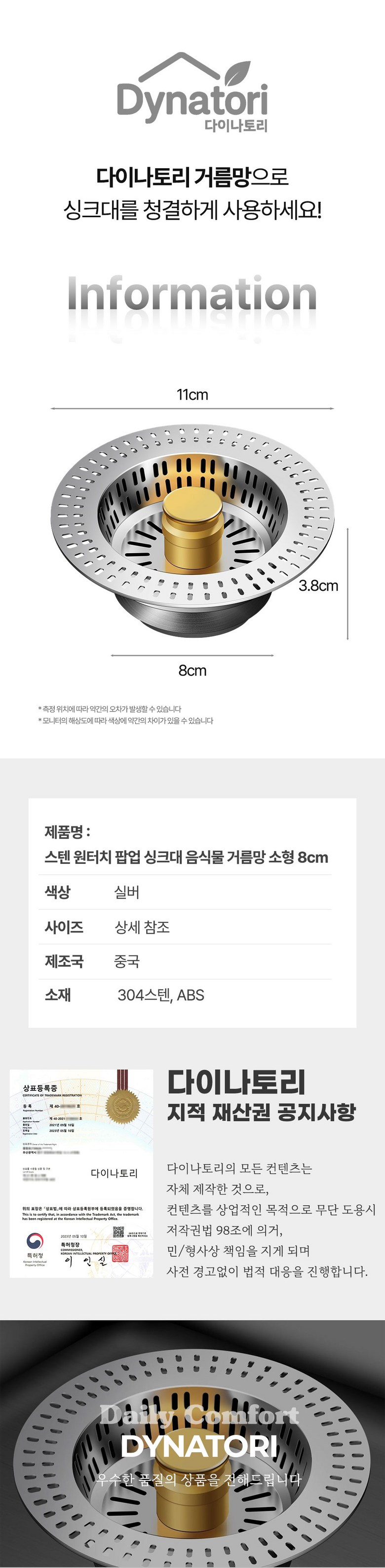 | 품명 및 모델명 | 다이나토리 스텐 원터치 팝업 싱크대 음식물 거름망 소형 8cm | 인증/허가 사항 | 해당사항없음 |