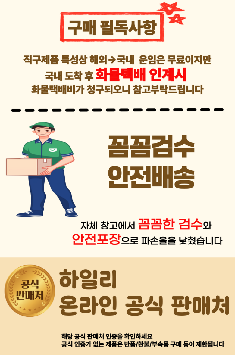 - 주문일 기준 동일 판매자 총 구매 금액이 면세 한도 초과 시 관부가세가 부과될 수 있습니다