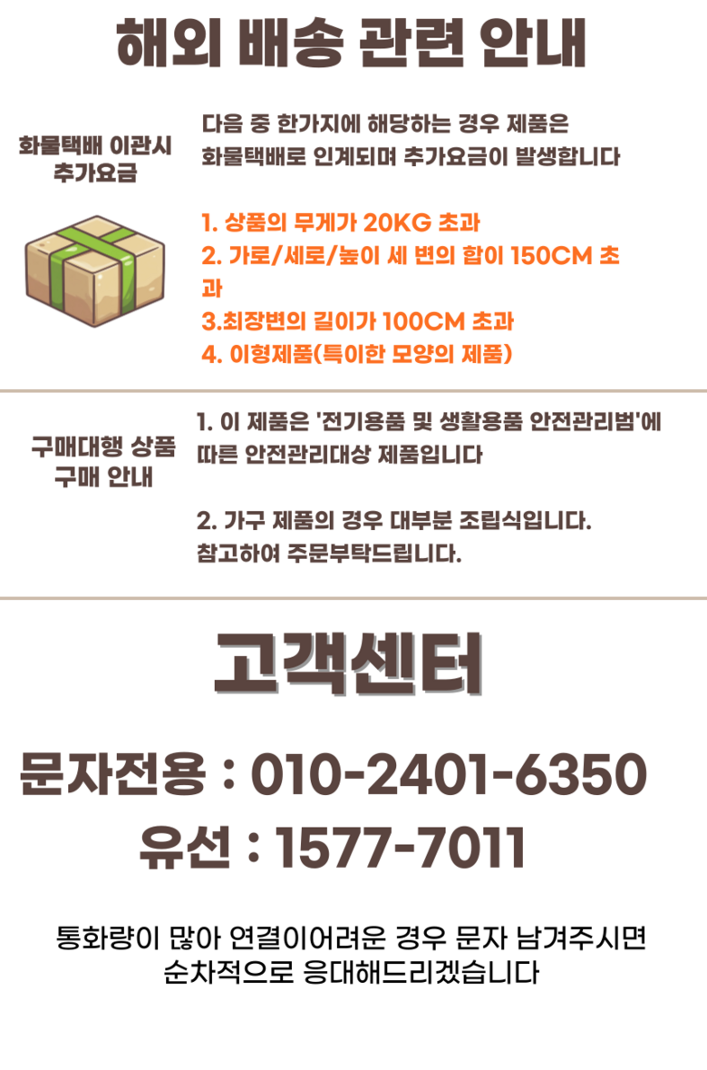 - ㆍ모니터 해상도의 차이로 인해 색상이나 이미지가 실제와 달라, 고객이 단순 변심으로 교환/반품을 무료로 요청하는 경우