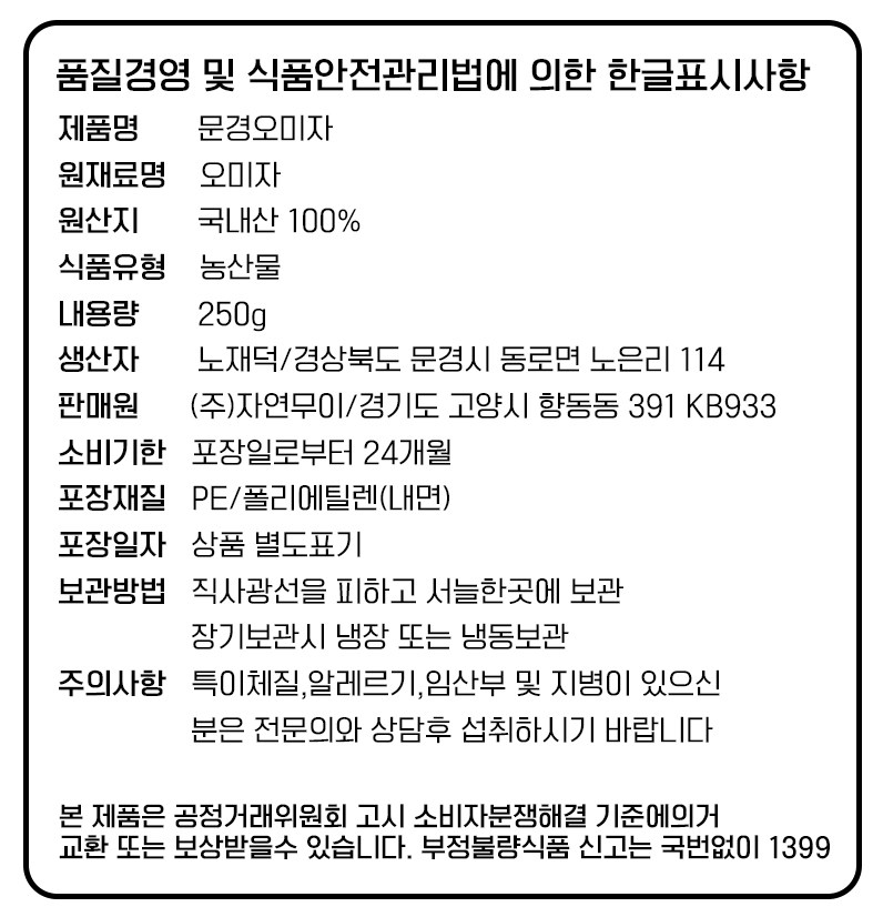 | 제조연월일, 소비기한 또는 품질유지기한 | 소비기한(또는 유통기한) : 2026년 11월 30일 이거나 그 이후인 상품 제조년월일 : 2024년 12월 01일 이후인 제조상품 | 세부 품목군별 표시사항 | 농수산물 : 유전자변형(해당 없음) / 지리적 표시사항(해당 없음) |