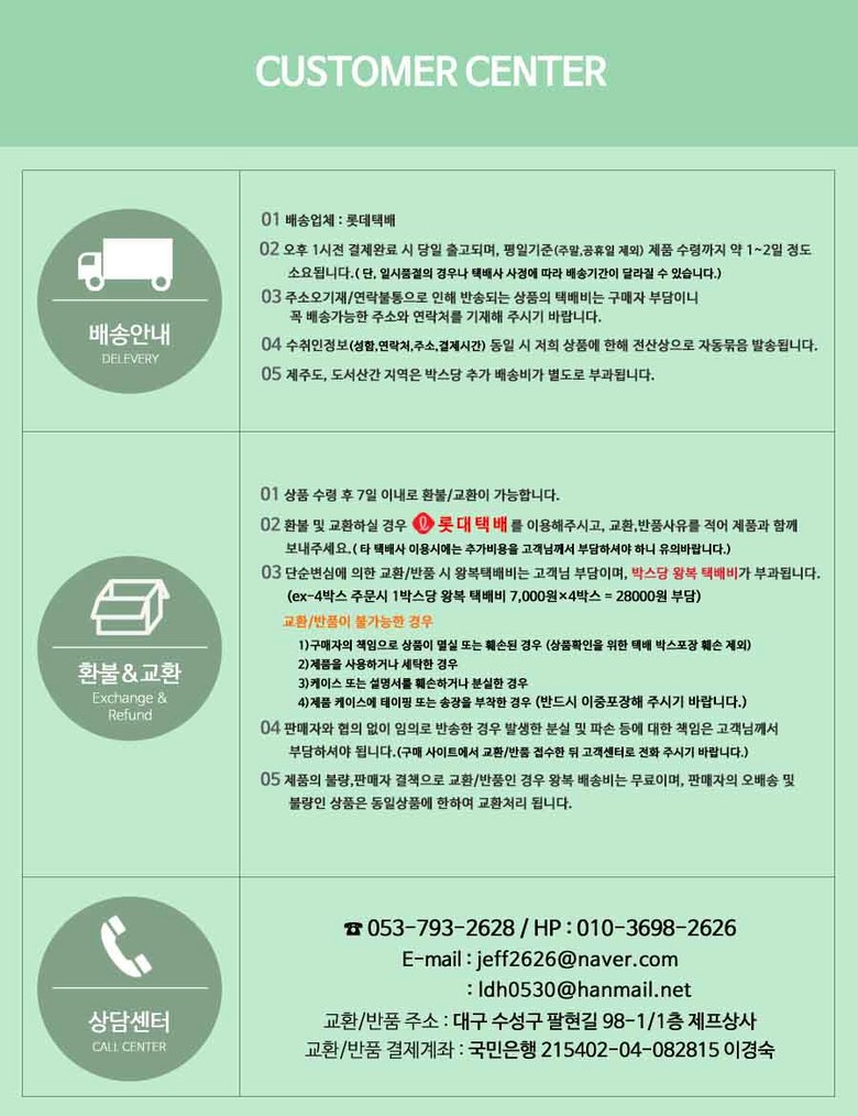- ㆍ모니터 해상도의 차이로 인해 색상이나 이미지가 실제와 달라, 고객이 단순 변심으로 교환/반품을 무료로 요청하는 경우