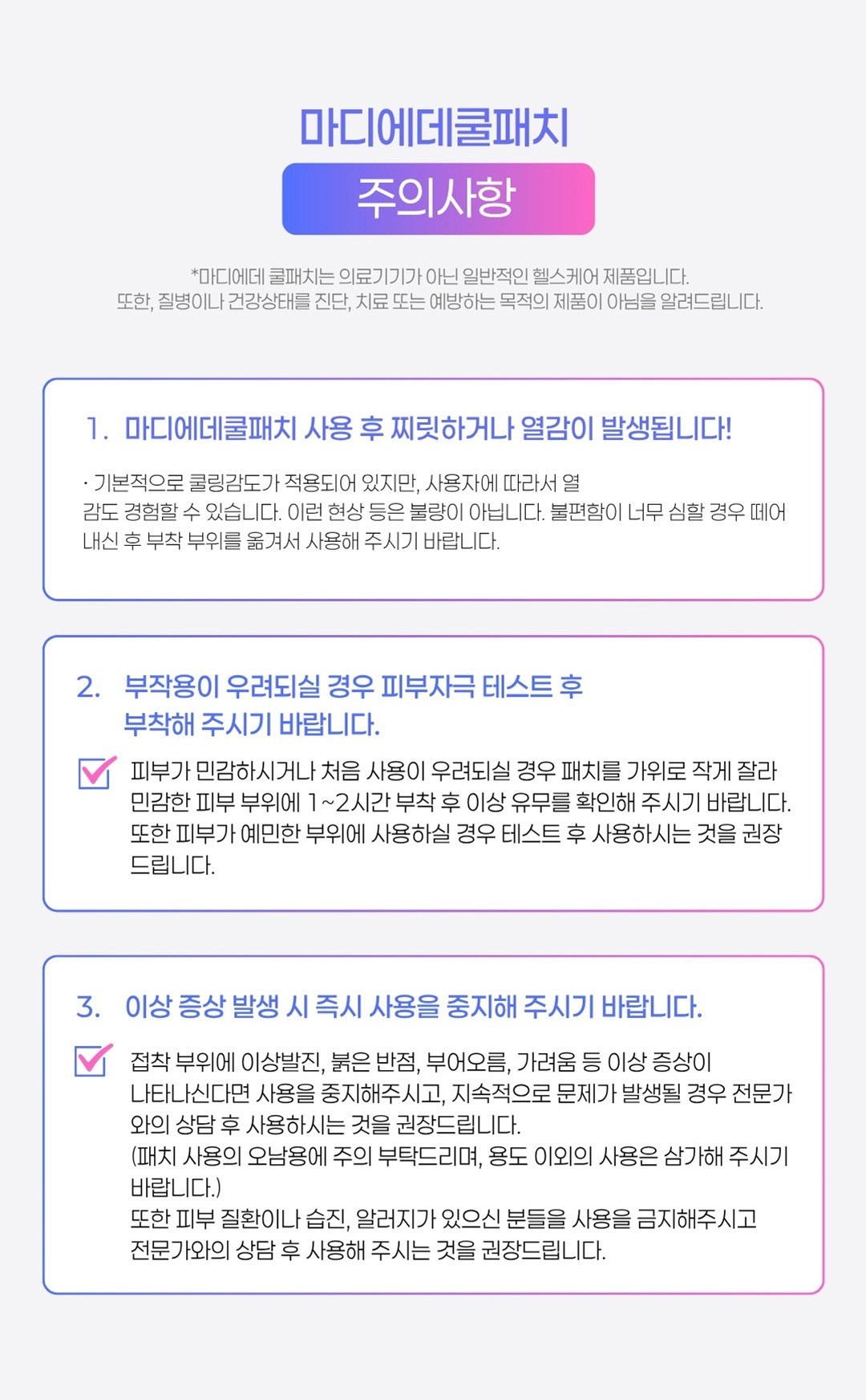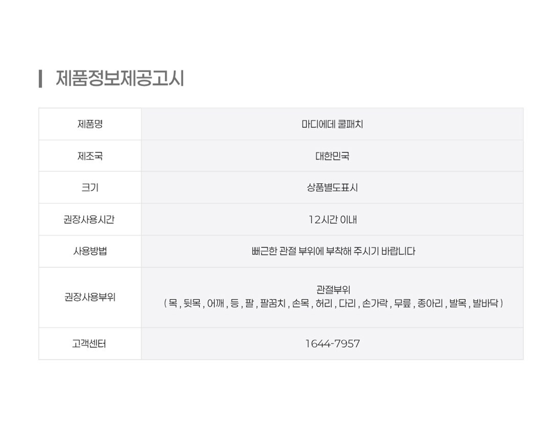 | 품명 및 모델명 | 마디에데 쿨패치 | 인증/허가 사항 | 해당없음 |
