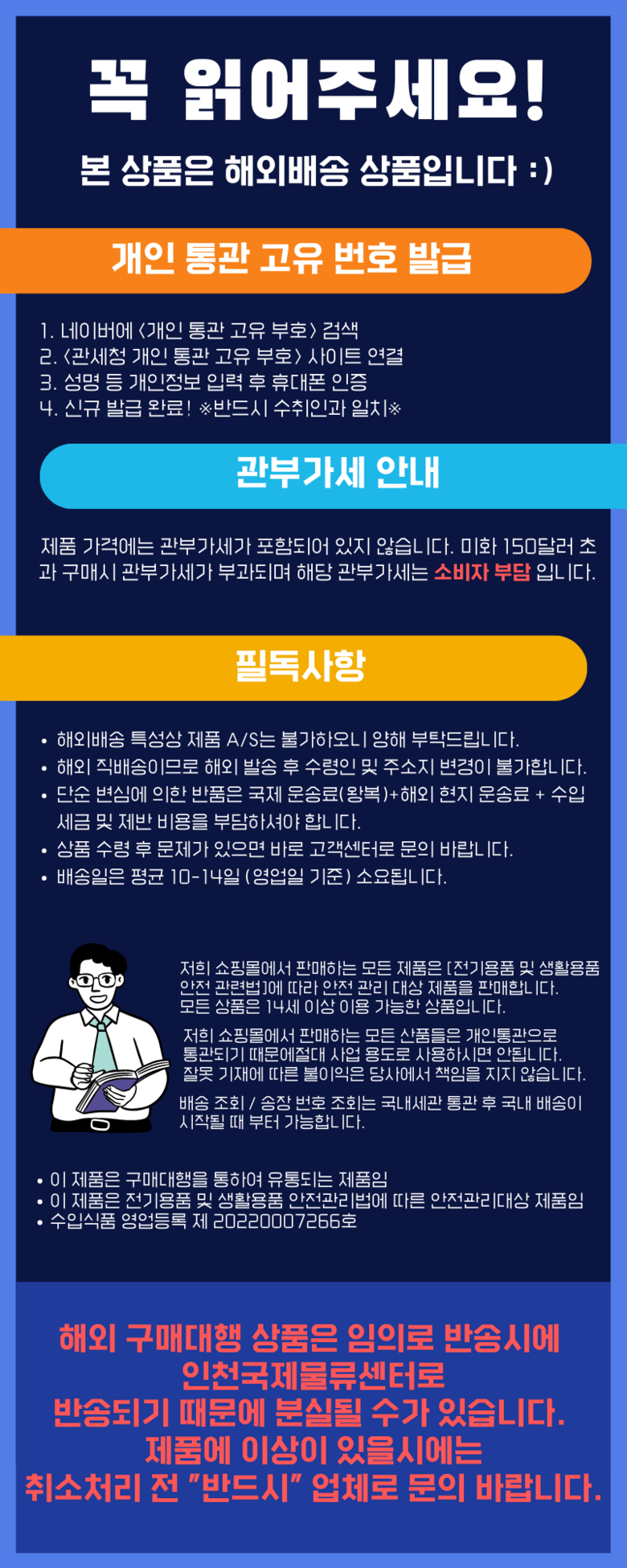 - 법규 개정에 따라 개인통관고유부호 검증 절차가 강화되었습니다. 결제 단계에서 받는 사람의 정보가 관세청 등록 정보 (성명, 휴대폰, 개인통관고유부호, 주소) 와 일치하는지 확인해주세요.