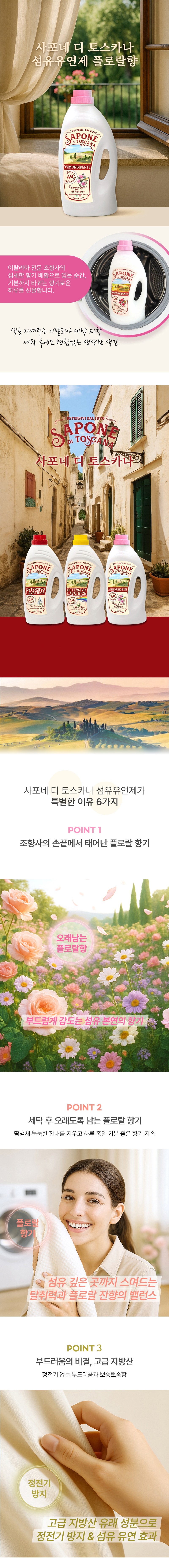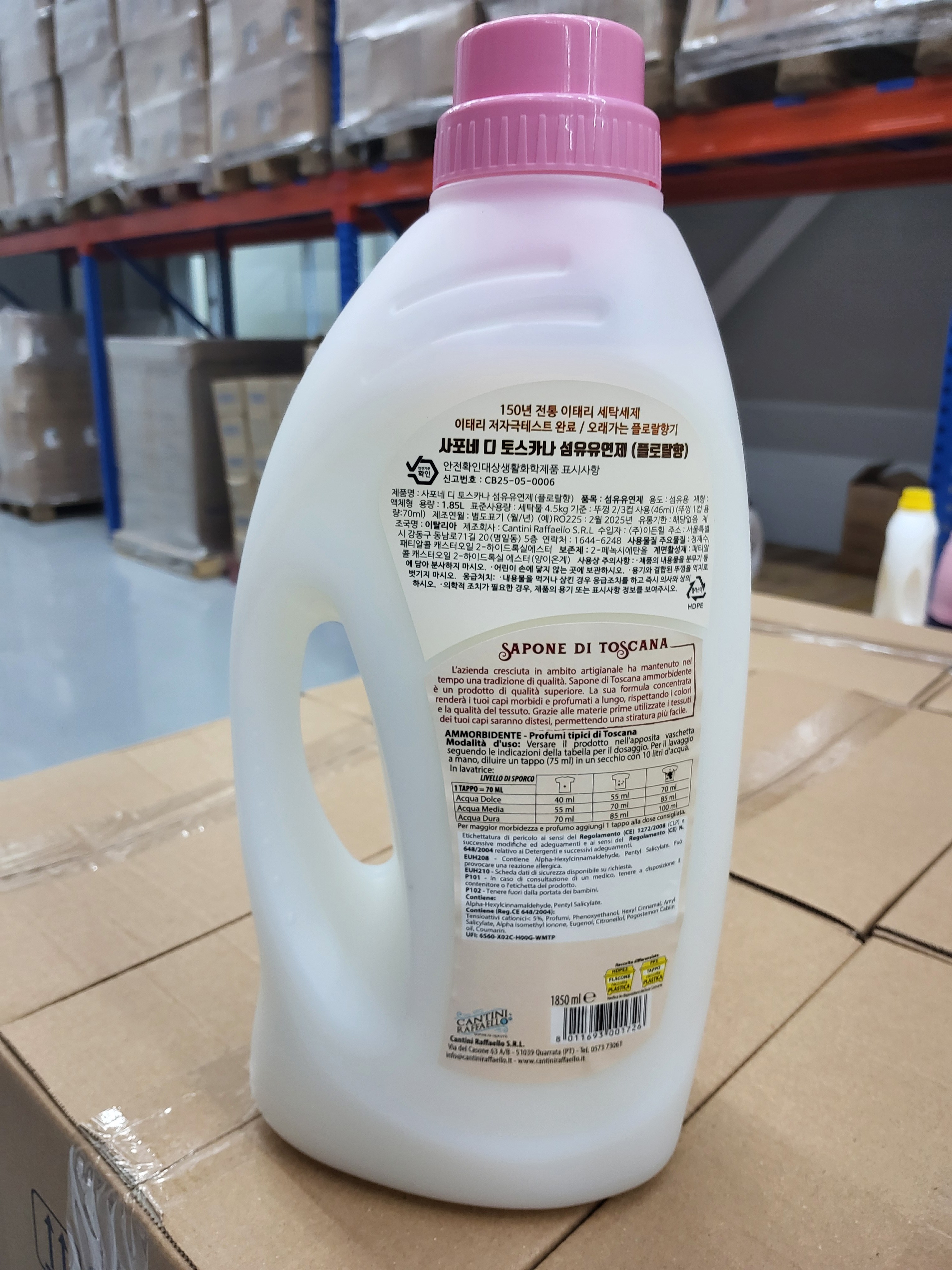 | 품목 및 제품명 | 섬유유연제 / 사포네 디 토스카나 섬유유연제 (플로랄향) | 용도(표백제의 경우 계열을 함께표시) 및 제형 | 섬유용 / 액체형 |