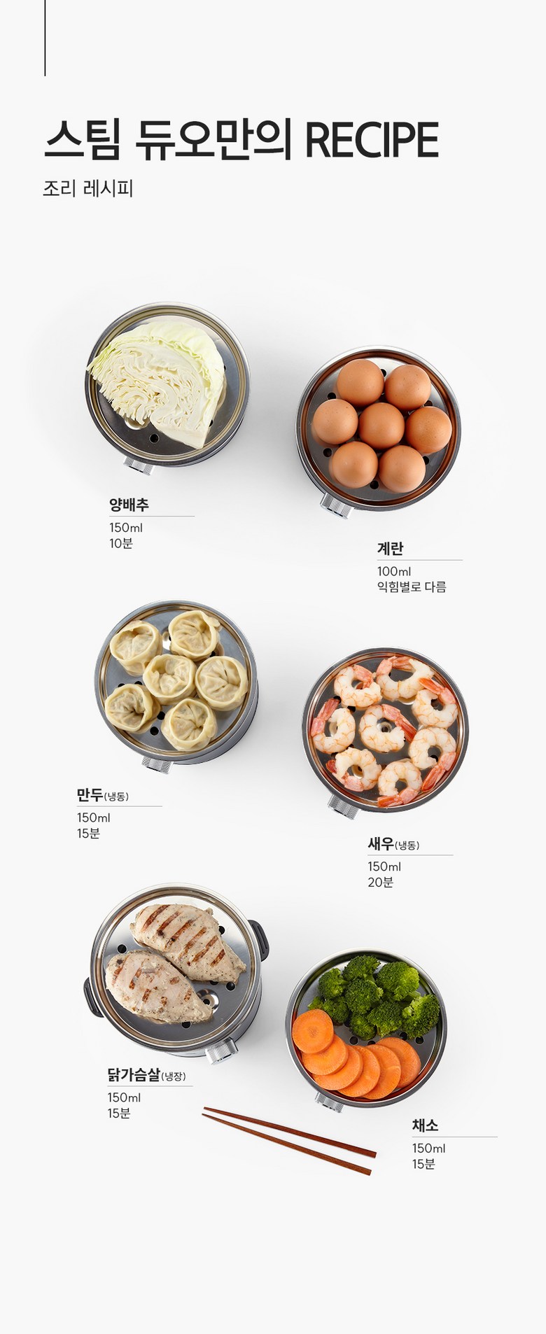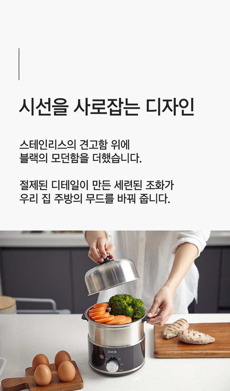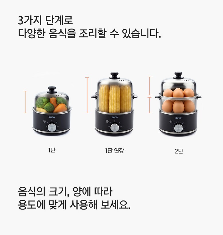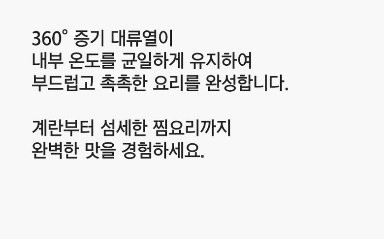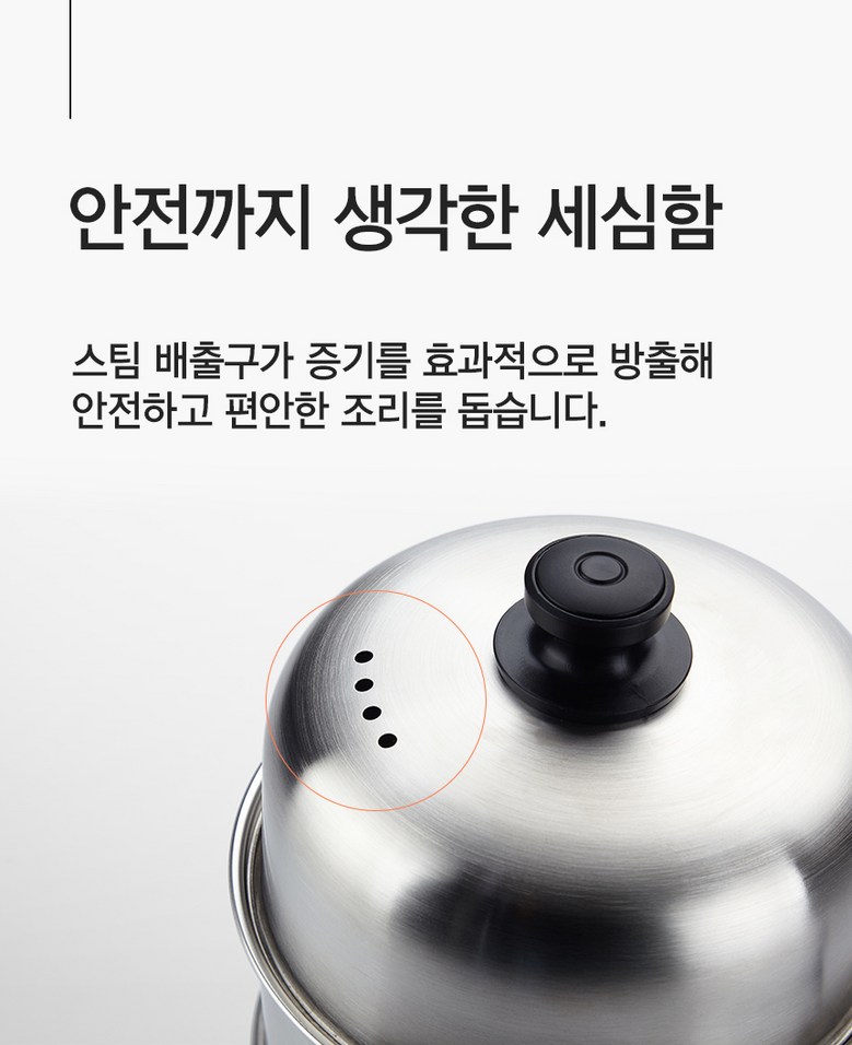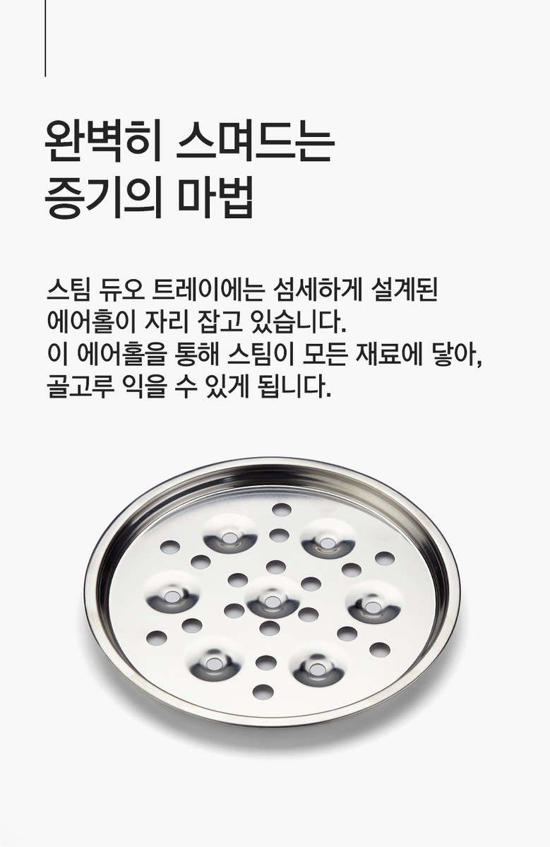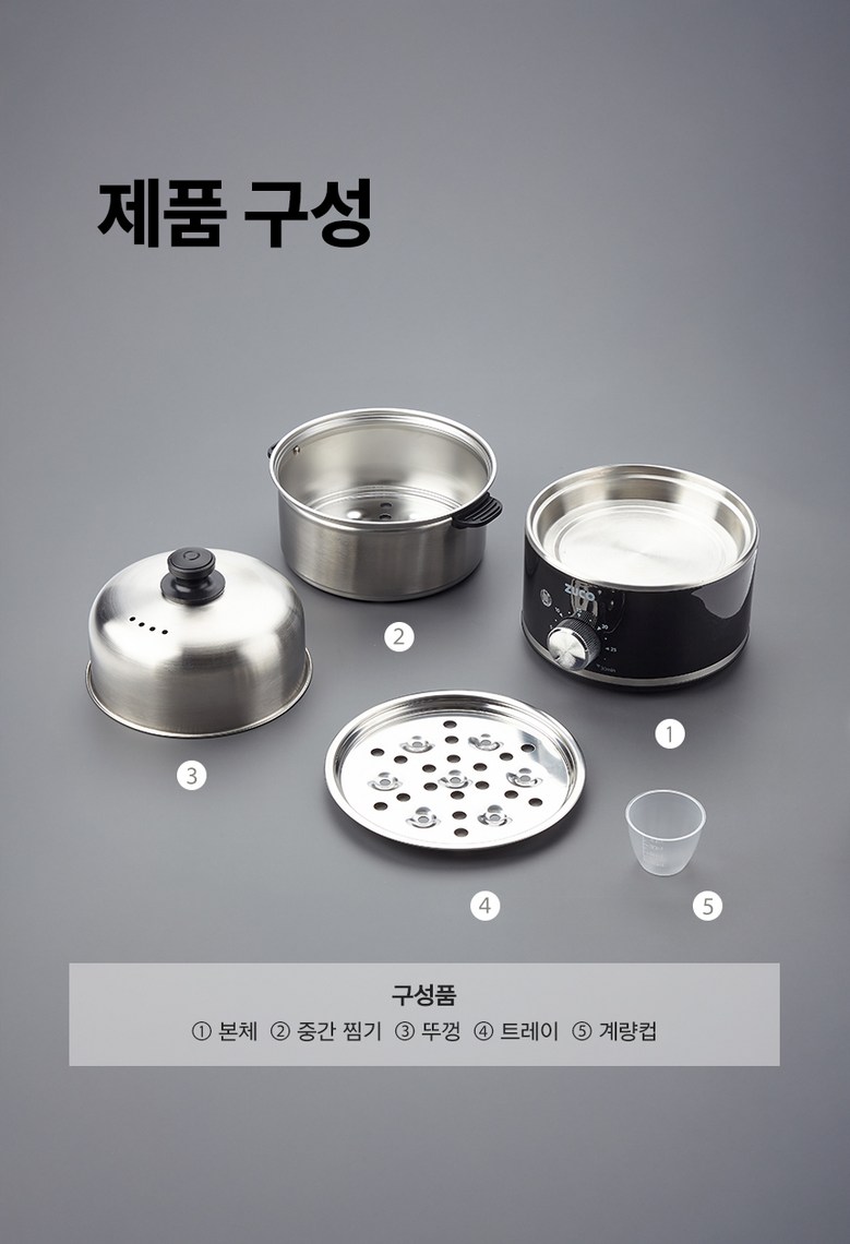 - 구성품: 본체(가열판), 트레이, 중간 찜판, 뚜껑, 께량컵, 사용설명서
