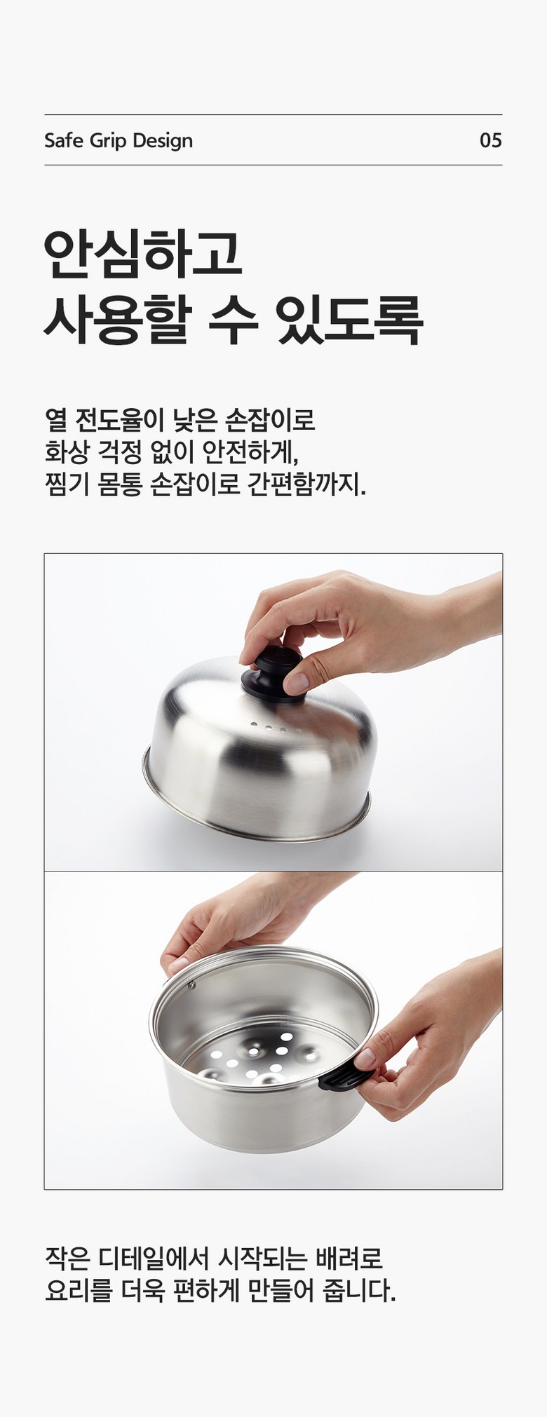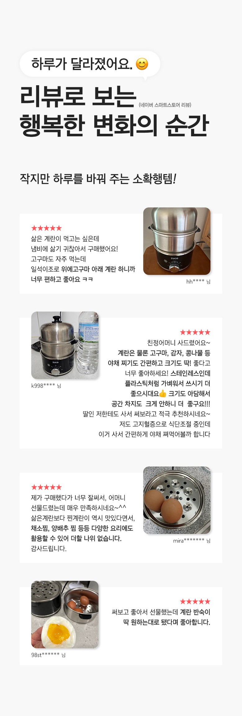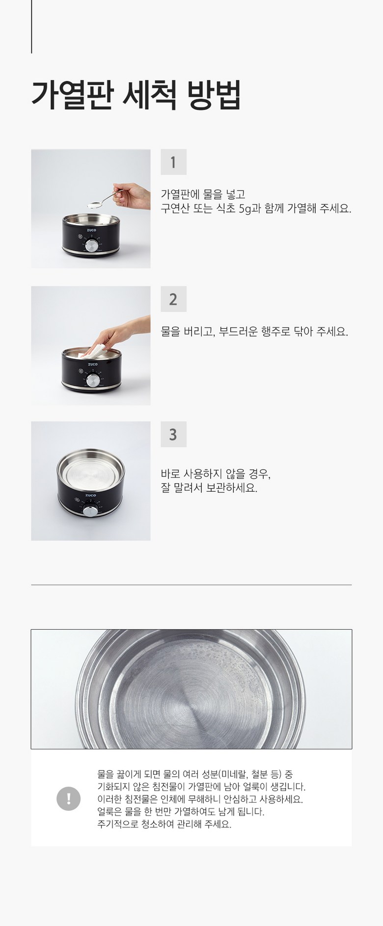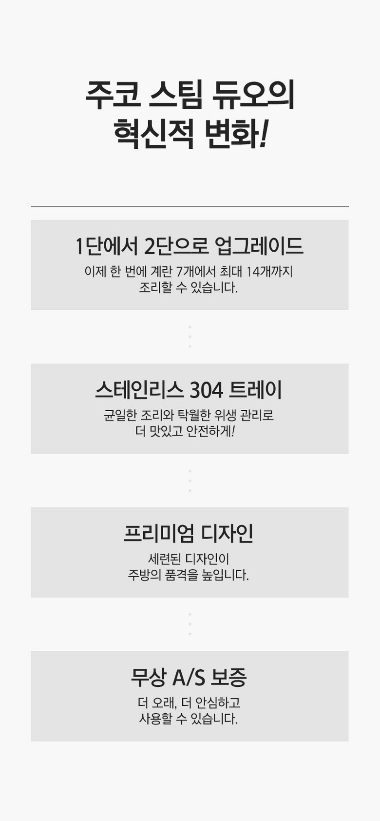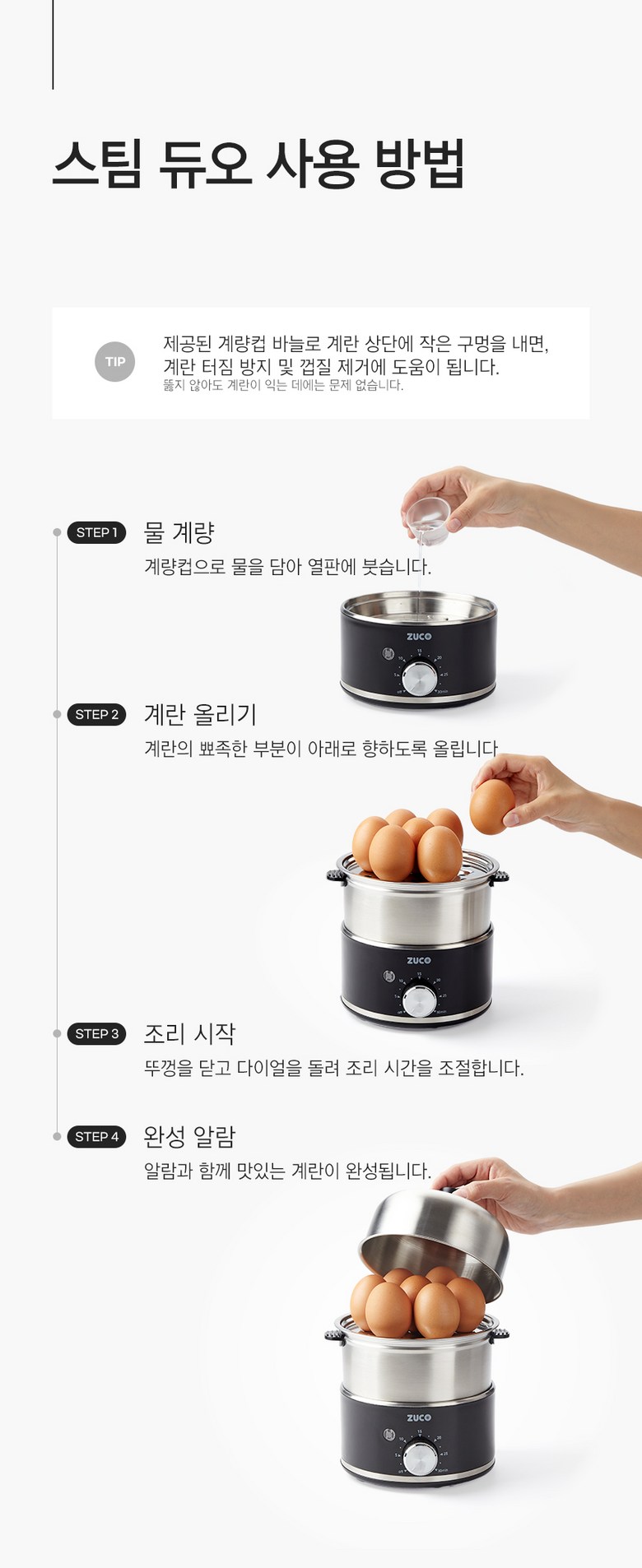 - 구성품: 본체(가열판), 트레이, 중간 찜판, 뚜껑, 께량컵, 사용설명서