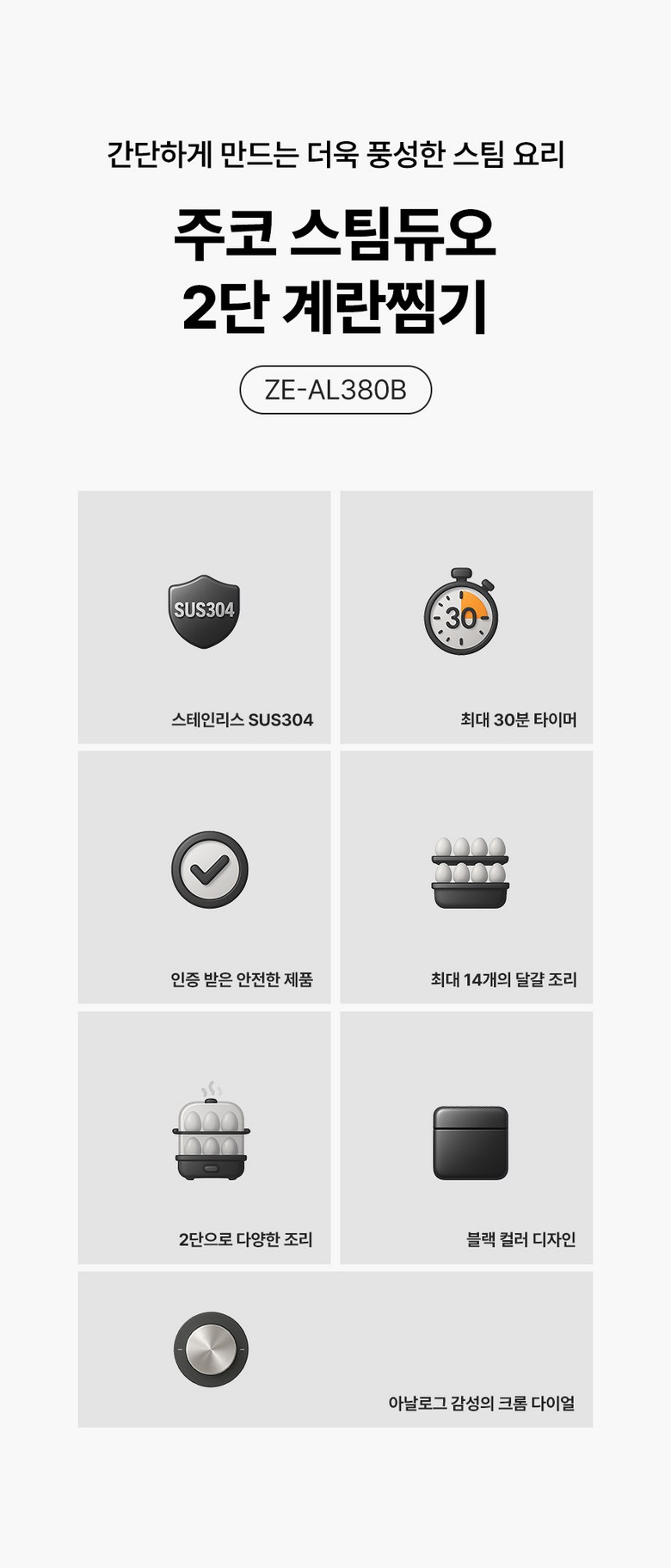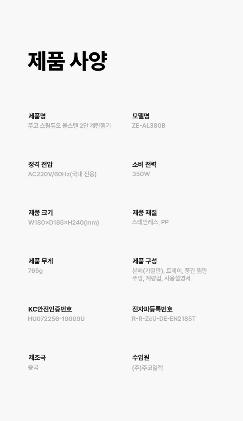 | 품명 및 모델명 | 주코 스팀듀오 올스텐 2단 계란찜기 / ZE-AL380B | KC 인증정보 | HU072256-19009U |