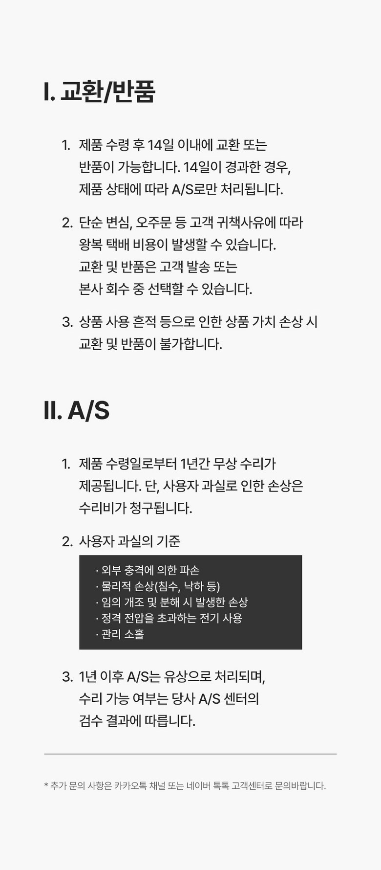 - ㆍ교환/반품에 관한 일반적인 사항은 판매자가 제시사항보다 관계법령이 우선합니다.