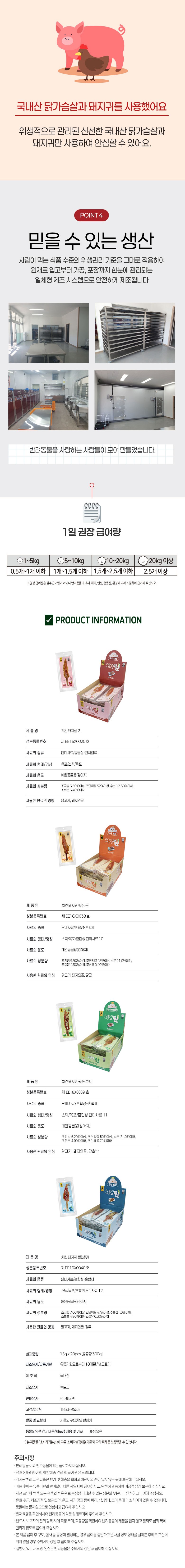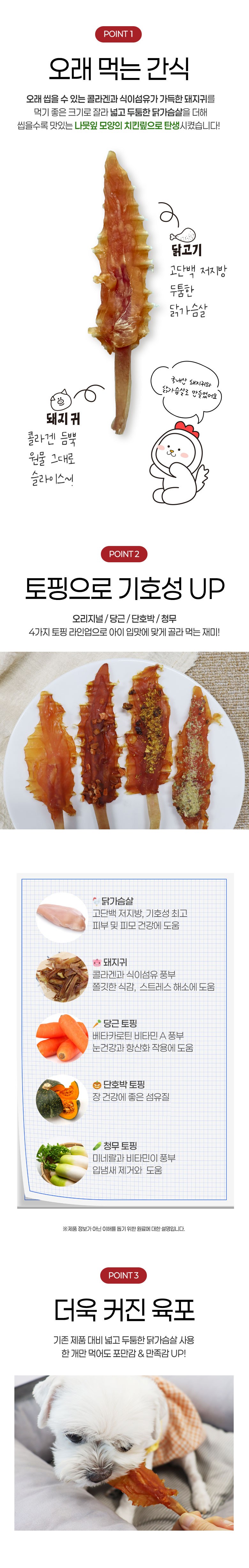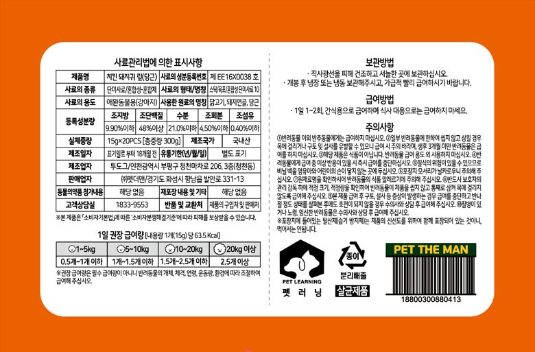 | 품명 및 모델명 | 치킨 돼지귀 맆(당근) | 인증/허가 사항 | 사료관리법에 따른 성분등록번호 : 컨텐츠 참조 |