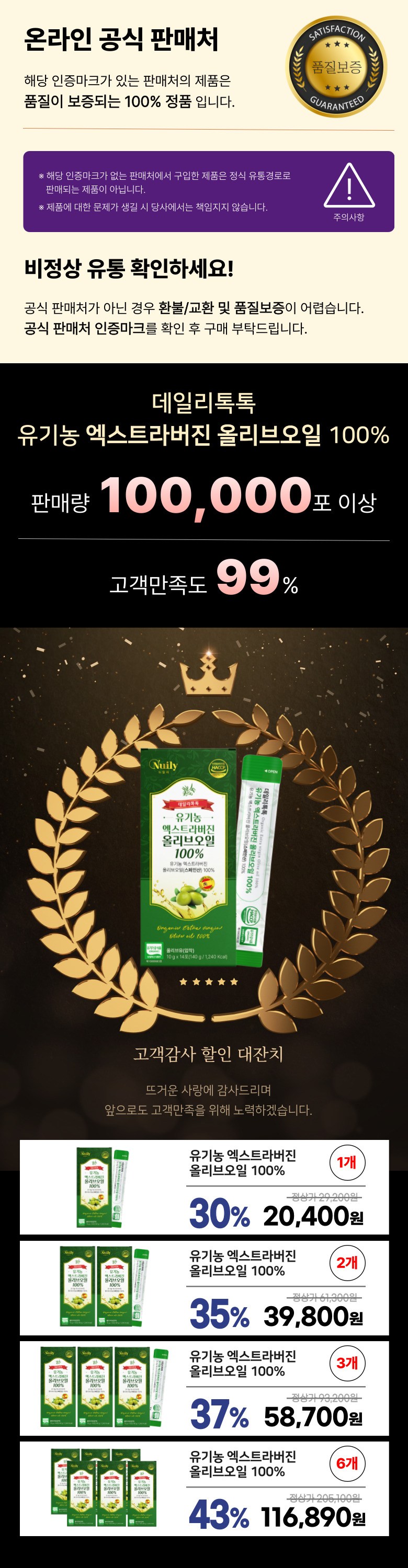 | 포장단위별 내용물의 용량(중량), 수량 | 10g x 14포 (140g / 1,240kcal) | 원재료명 및 함량 | 유기농 엑스트라버진 올리브오일(스페인산) 100% |
