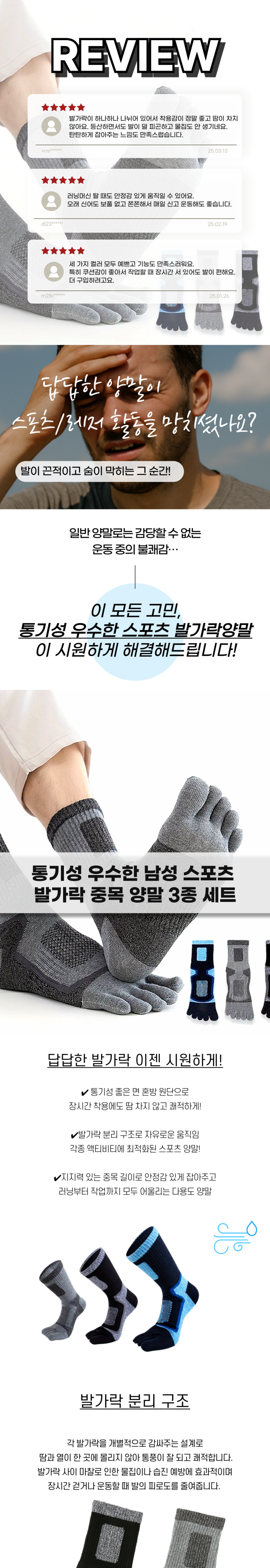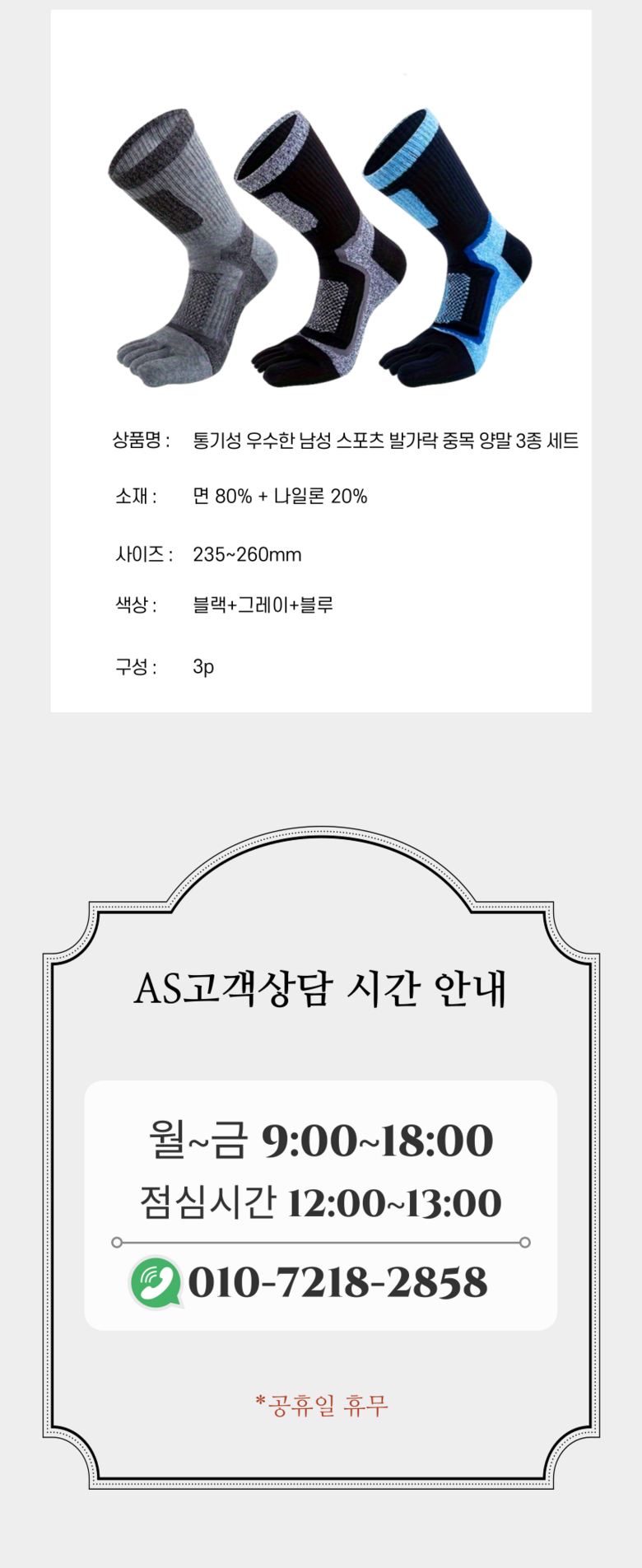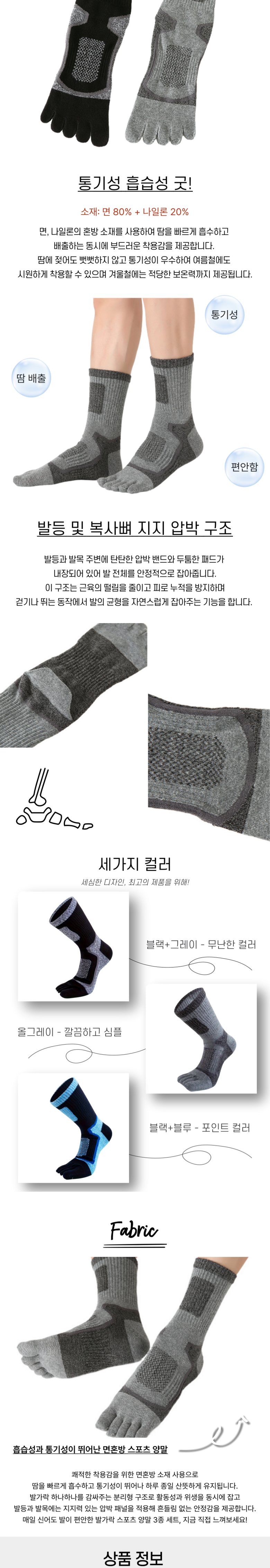 | 품명 및 모델명 | 통기성 우수한 남성 스포츠 발가락 중목 양말 3종 세트 | 인증/허가 사항 | 해당사항없음 |