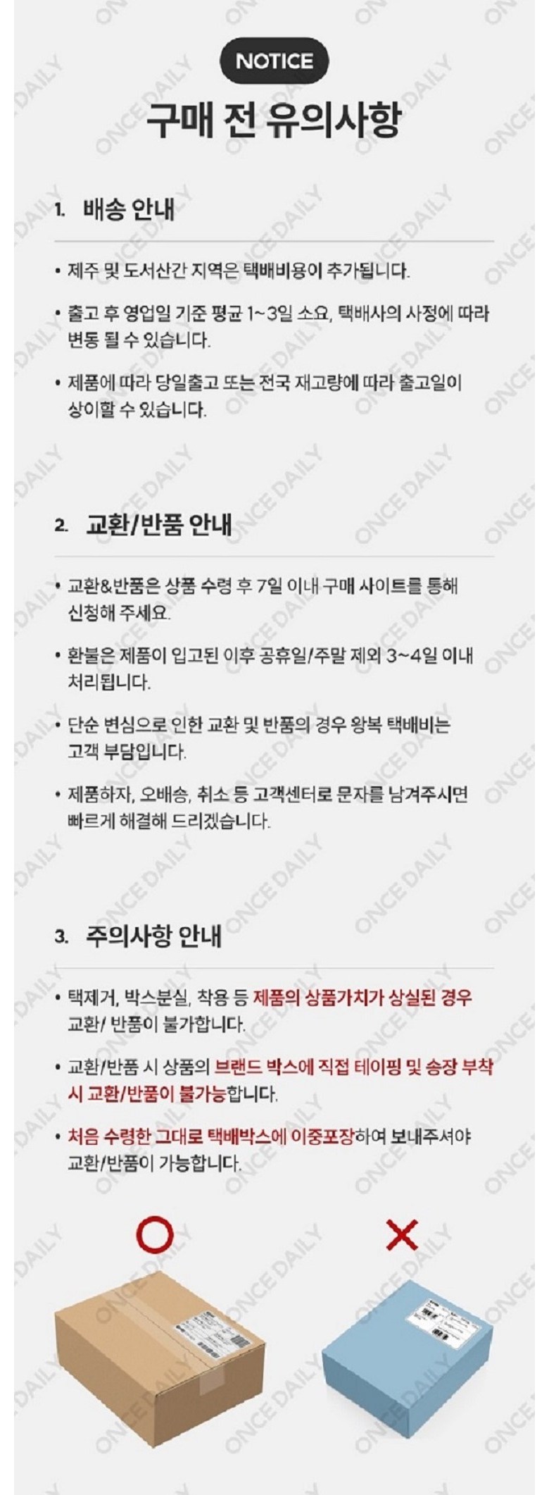- ㆍ교환/반품에 관한 일반적인 사항은 판매자가 제시사항보다 관계법령이 우선합니다.