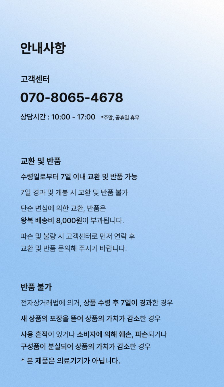 | 소비자상담 및 교환반품 문의 | 쿠팡고객센터 1577-7011 배송 및 환불/교환에 대한 문의는 마이쿠팡-고객센터 내 상담하기를 이용해주세요. | ||