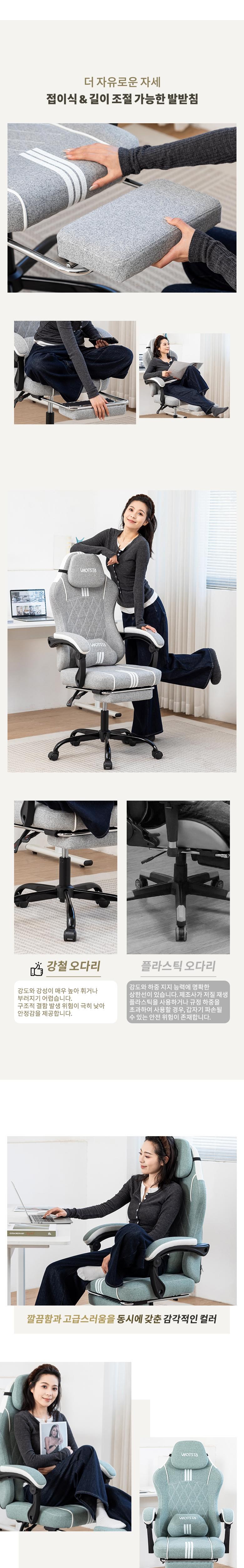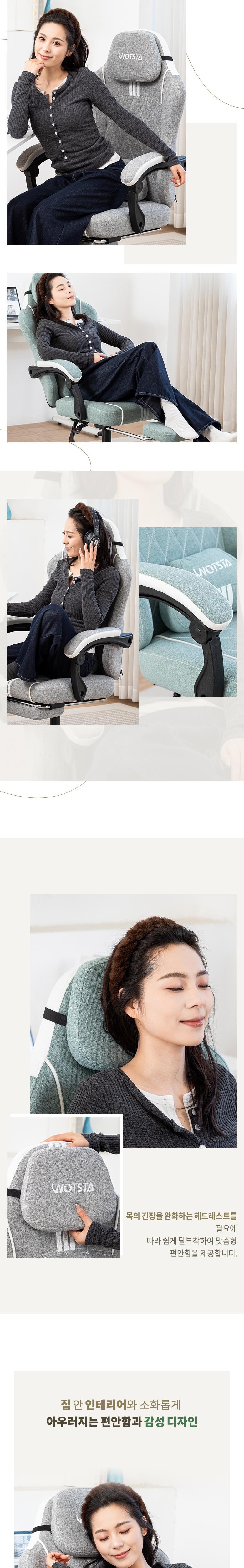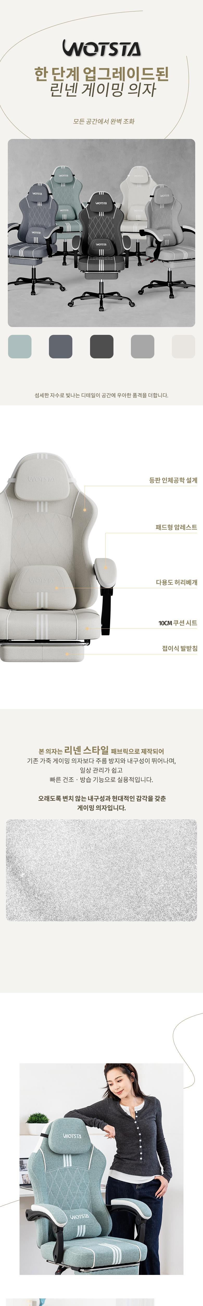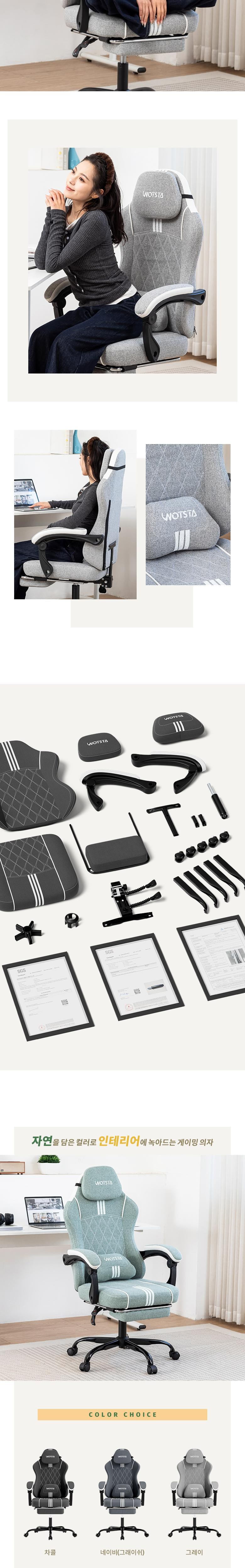 | 색상 | 그레이,네이비(그래이쉬),민트 그린,베이지,차콜 | 구성품 | 게이밍의자, 헤드레스트 ,허리 쿠션, 발 받침대 |