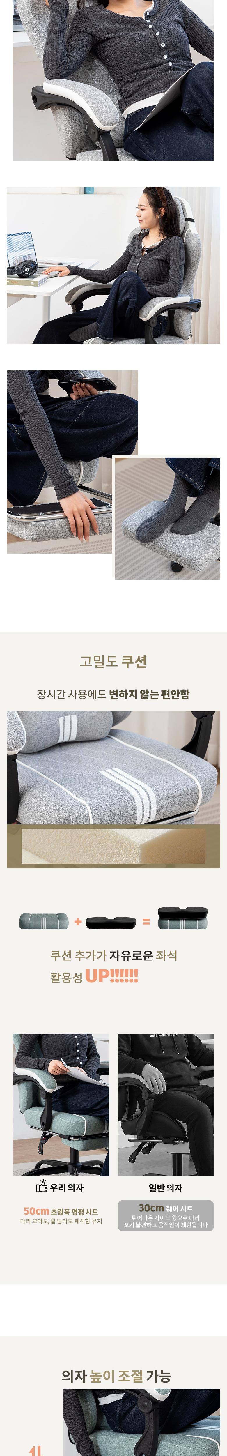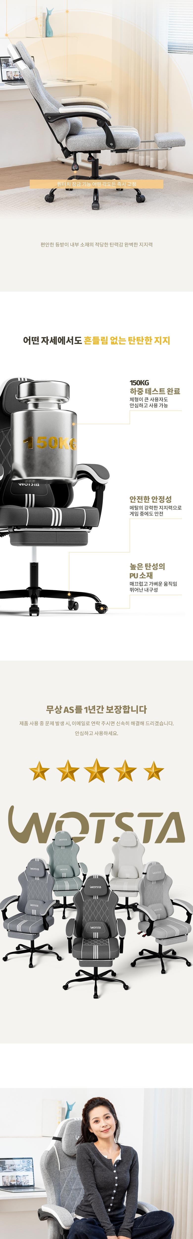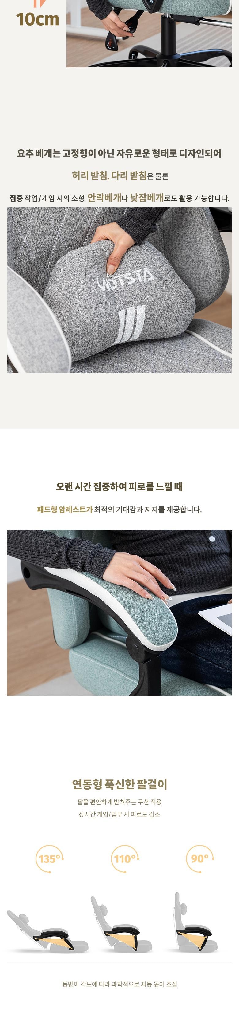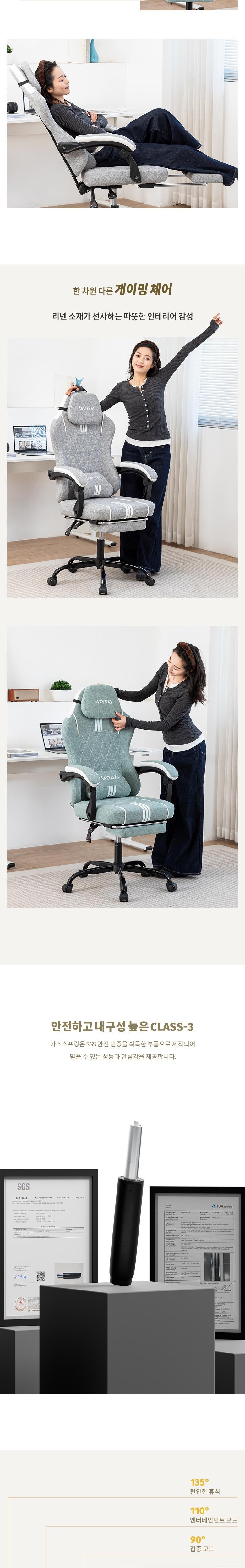 | 색상 | 그레이,네이비(그래이쉬),민트 그린,베이지,차콜 | 구성품 | 게이밍의자, 헤드레스트 ,허리 쿠션, 발 받침대 |
