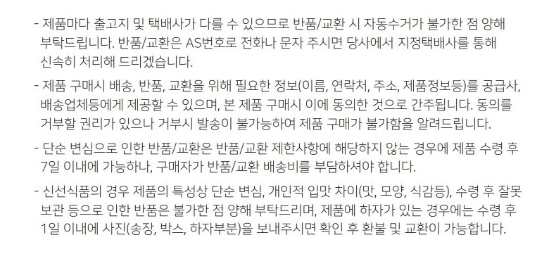 - ㆍ교환/반품에 관한 일반적인 사항은 판매자가 제시사항보다 관계법령이 우선합니다.