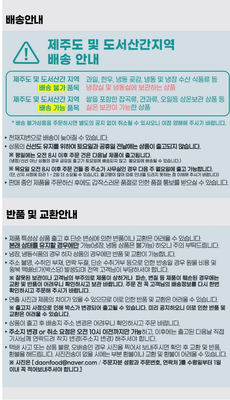 | 배송방법 | 순차배송 | 배송비 | 무료배송 · 도서산간 추가 배송비 - 제주 지역: 3,000원 - 도서산간 지역: 3,000원 |