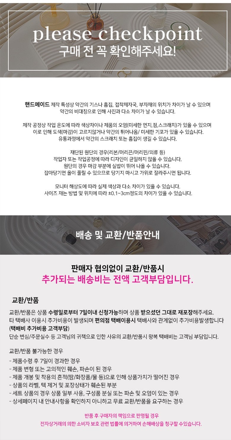 - ㆍ모니터 해상도의 차이로 인해 색상이나 이미지가 실제와 달라, 고객이 단순 변심으로 교환/반품을 무료로 요청하는 경우
