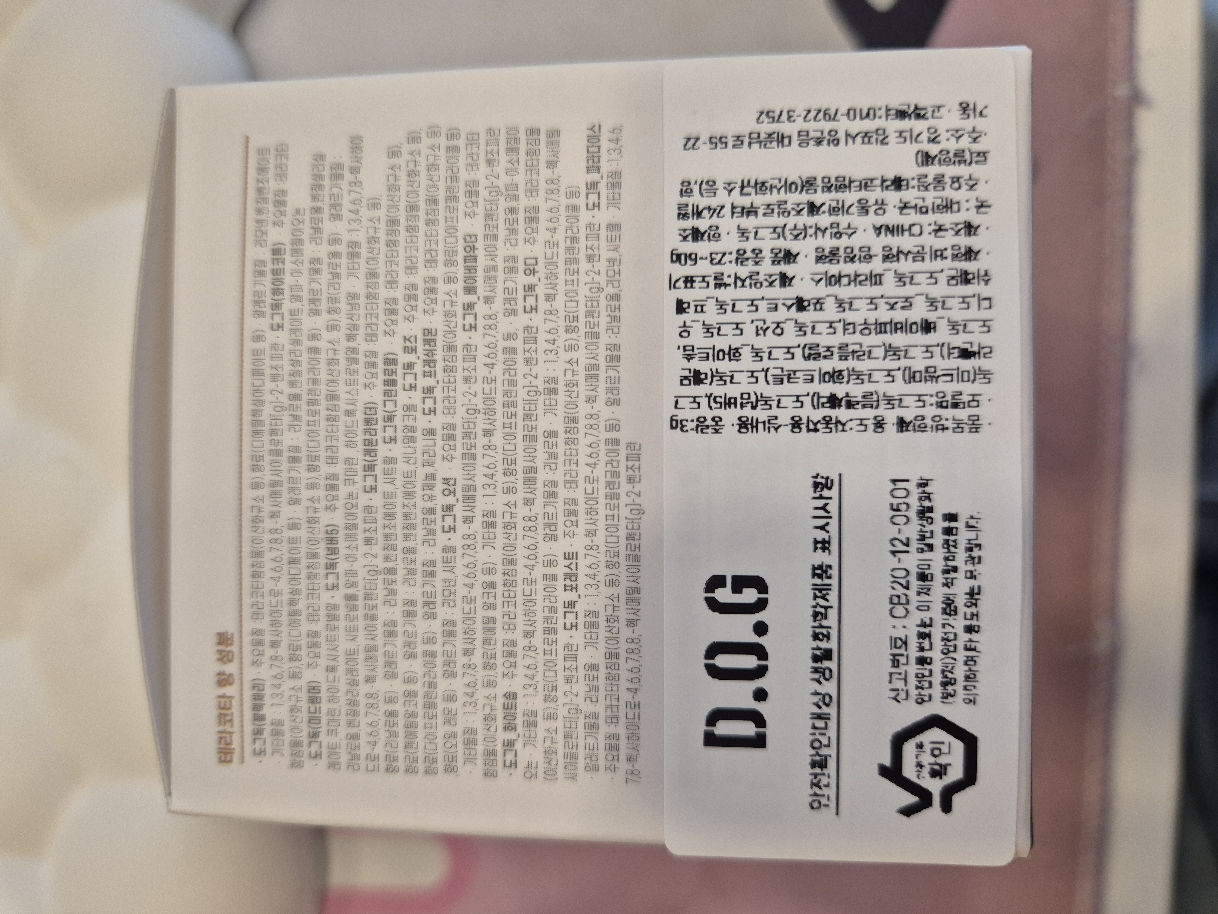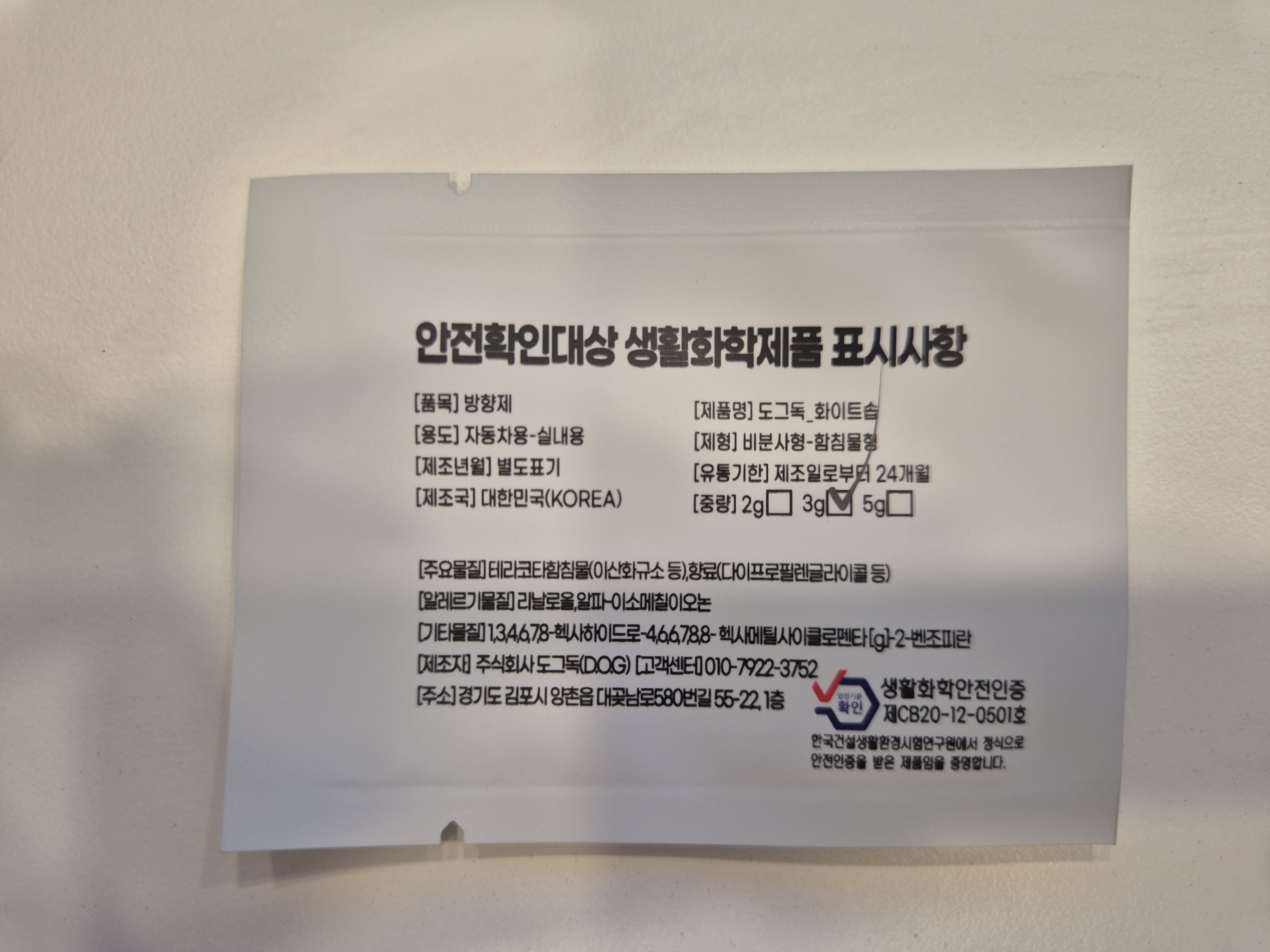 | 품목 및 제품명 | 방향제 / 도그독(화이트솝) | 용도(표백제의 경우 계열을 함께표시) 및 제형 | 자동차용(실내용) / 비분사형-함침물형 |