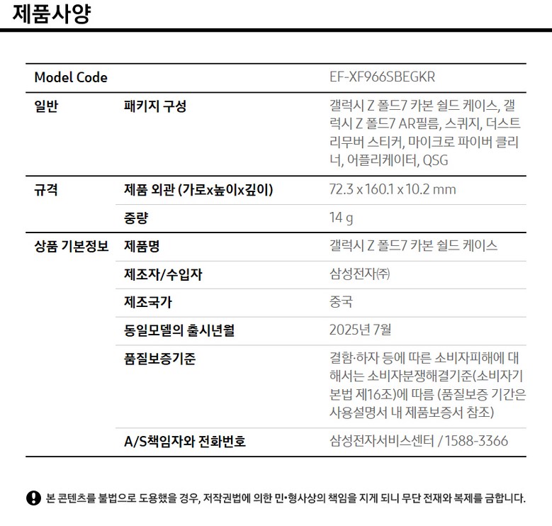 | 품명 및 모델명 | 삼성 정품 갤럭시 Z 폴드7 카본쉴드 케이스 | 인증/허가 사항 | 상품 상세페이지 참조 |