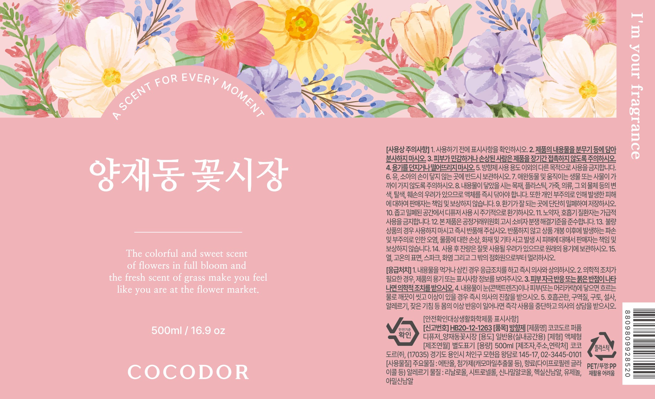 | 품목 및 제품명 | 방향제 / 코코도르 퍼퓸 디퓨저_양재동꽃시장 | 용도(표백제의 경우 계열을 함께표시) 및 제형 | 일반용(실내공간용) / 액체형 |