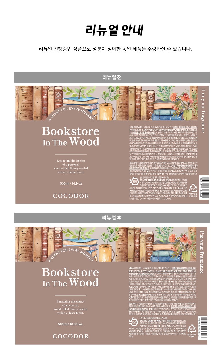 | 품목 및 제품명 | 방향제 / 리뉴얼 전: 코코도르 퍼퓸 디퓨저_북스토어인더우드 l 리뉴얼 후: 코코도르 디퓨저_북스토어인더우드 | 용도(표백제의 경우 계열을 함께표시) 및 제형 | 일반용(실내공간용) / 액체형 |