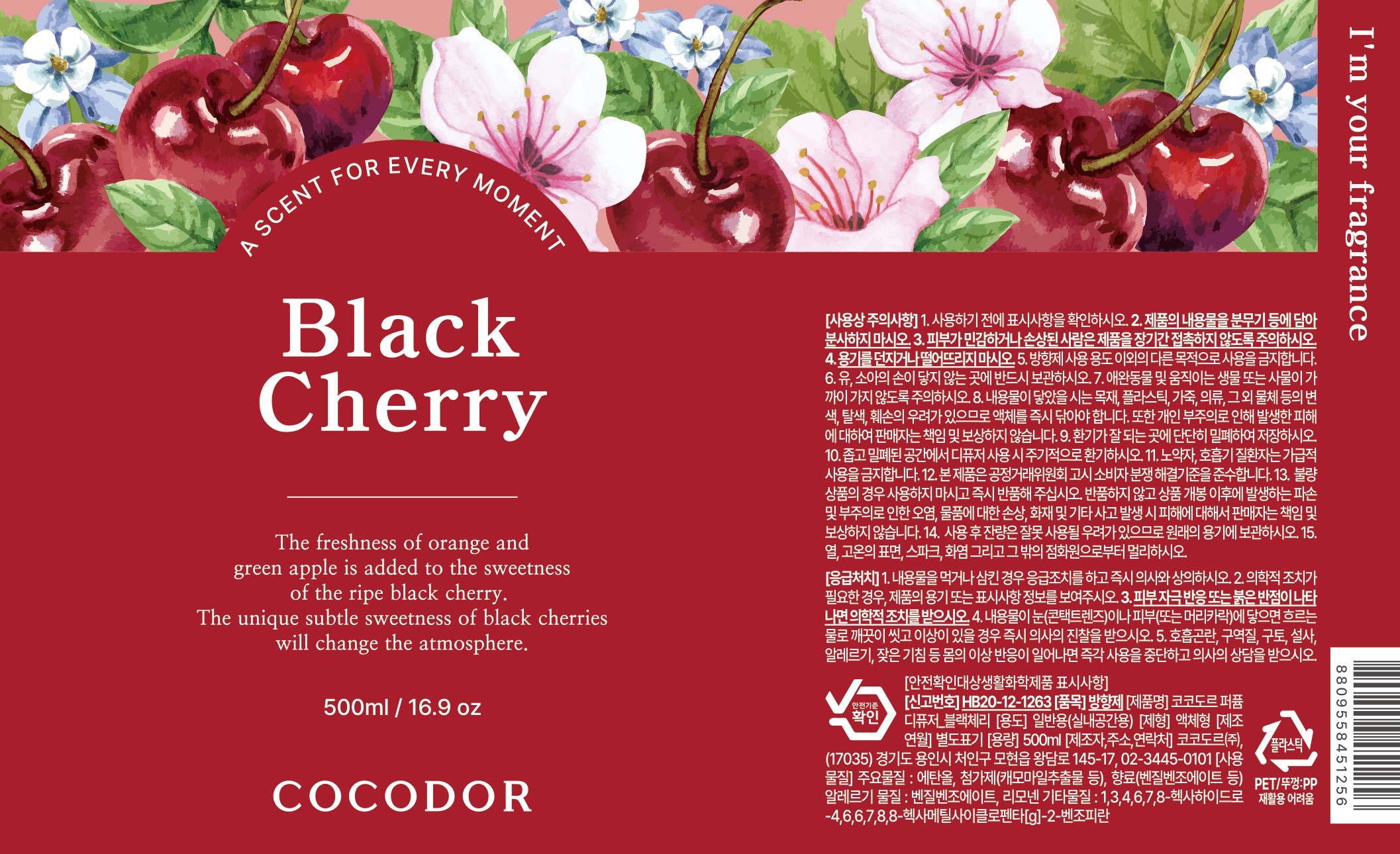 | 품목 및 제품명 | 방향제 / 코코도르 퍼퓸 디퓨저_블랙체리 | 용도(표백제의 경우 계열을 함께표시) 및 제형 | 일반용(실내공간용) / 액체형 |