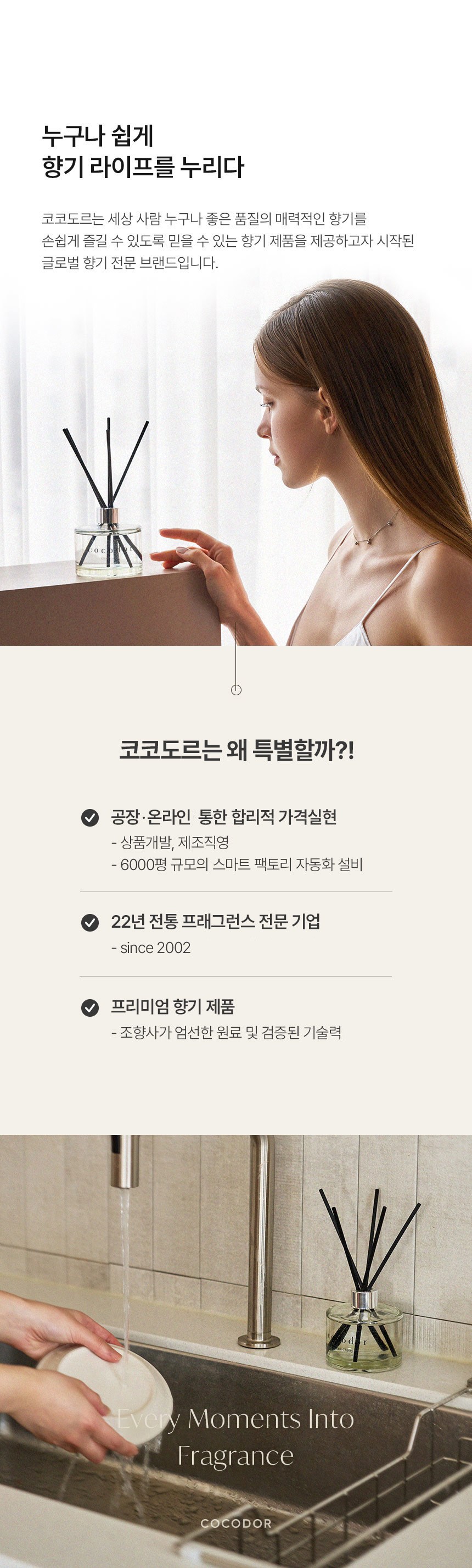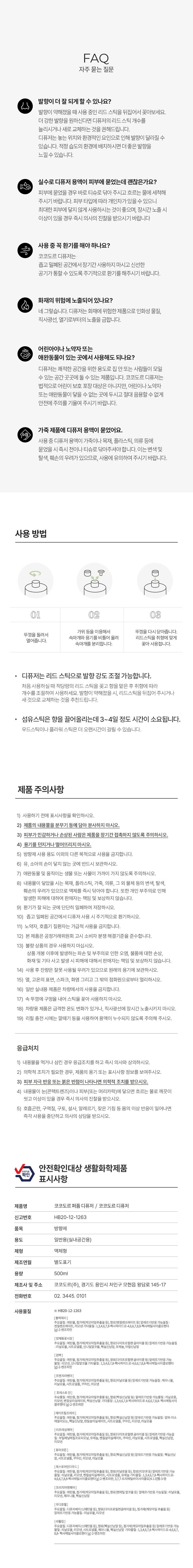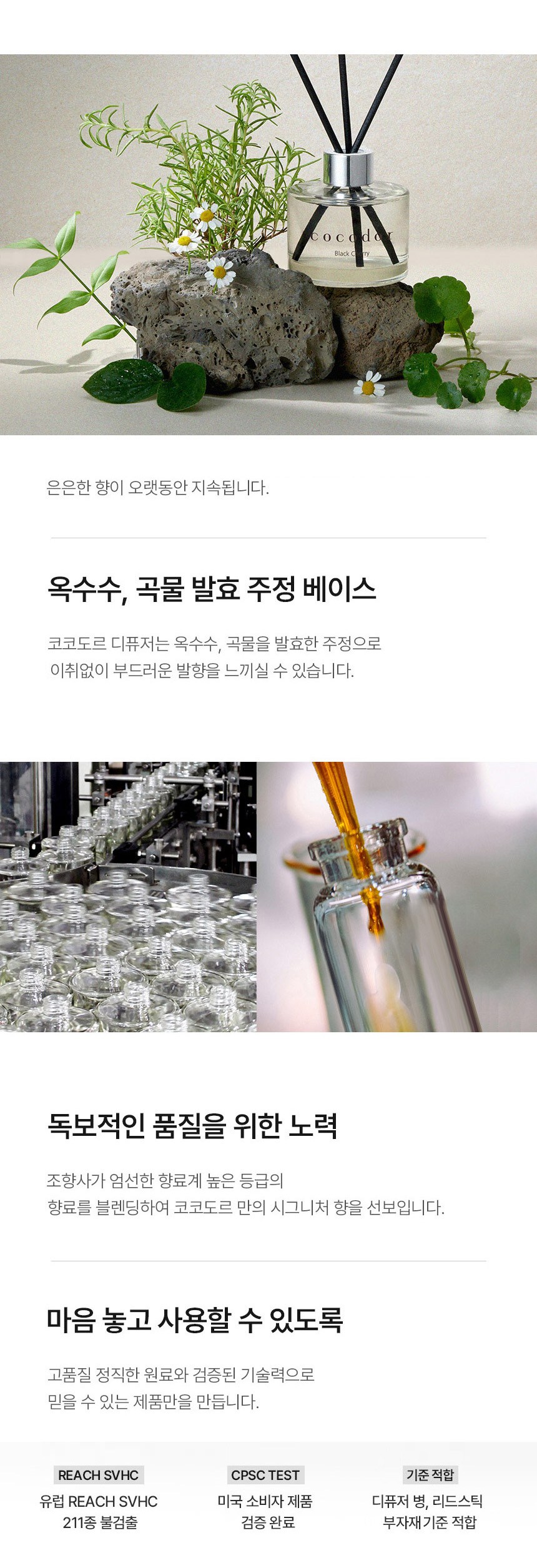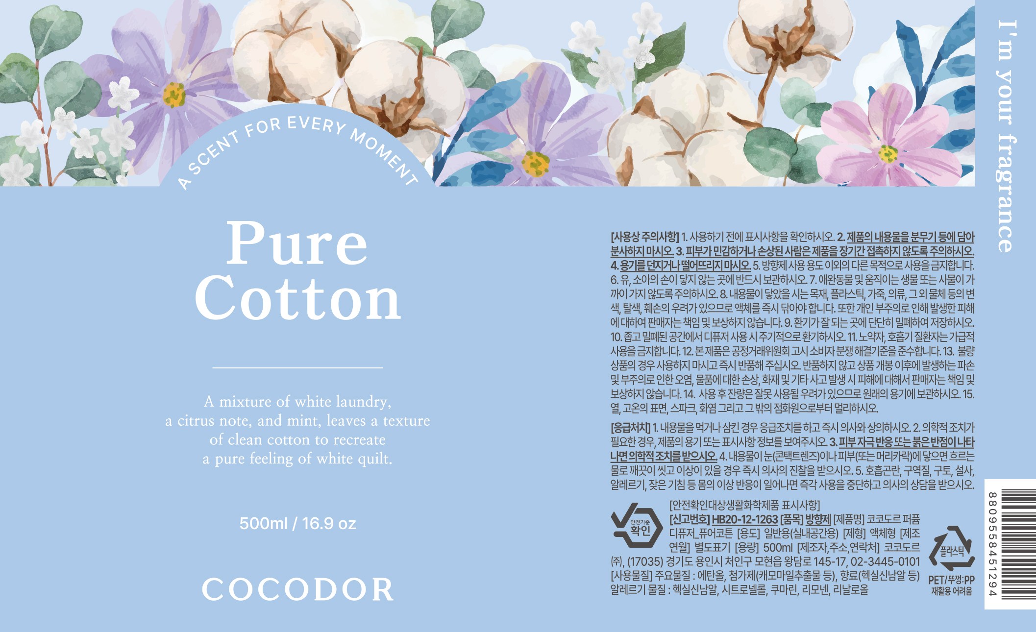 | 품목 및 제품명 | 방향제 / 리뉴얼 전: 코코도르 퍼퓸 디퓨저_퓨어코튼 l 리뉴얼 후: 코코도르 디퓨저_퓨어코튼 | 용도(표백제의 경우 계열을 함께표시) 및 제형 | 리뉴얼 전: 차동차용(실내용), 일반용(실내공간용) / 액체형 |