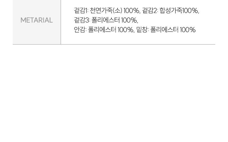 | 제품의 주소재(운동화인 경우에는 겉감,안감을 구분하여 표시) | 겉감1: 천연가죽(소) 100%, 겉감2: 합성가죽100%, 겉감3: 폴리에스터 100%, 안감: 폴리에스터 100%, 밑창: 폴리에스터 100% | 색상 | 상품 상세페이지 참조 |