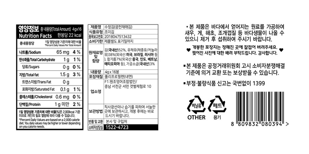 | 포장단위별 내용물의 용량(중량), 수량 | 4g*16개 | 원재료명 및 함량 | 컨텐츠 참조 |