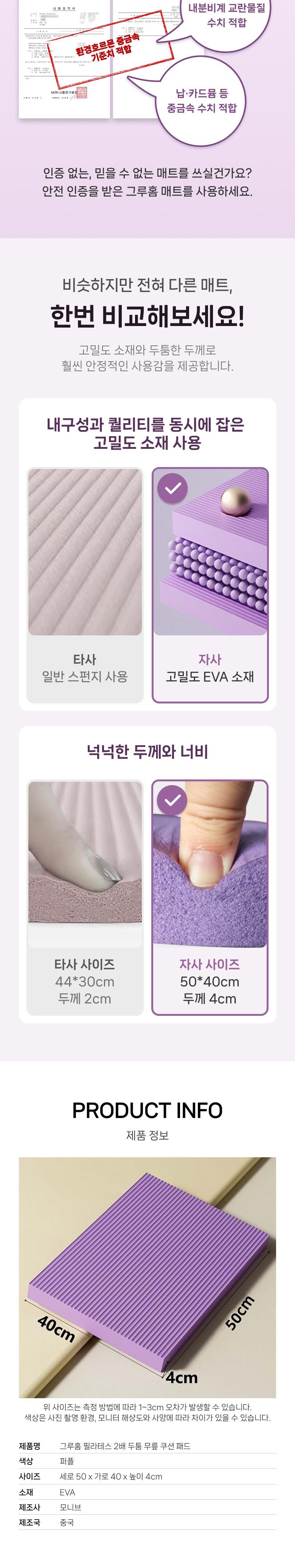 | 품명 및 모델명 | 그루홈 필라테스 무릎매트 | KC 인증정보 | 상품 상세페이지 참조 |