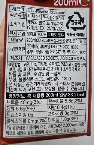 | 포장단위별 내용물의 용량(중량), 수량 | 200ml * 24개 | 원재료명 및 함량 | 컨텐츠 참조 |