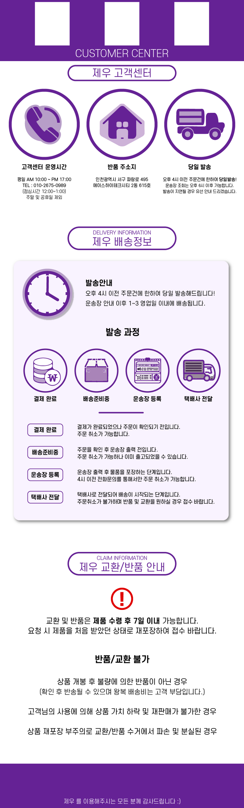 - ㆍ모니터 해상도의 차이로 인해 색상이나 이미지가 실제와 달라, 고객이 단순 변심으로 교환/반품을 무료로 요청하는 경우