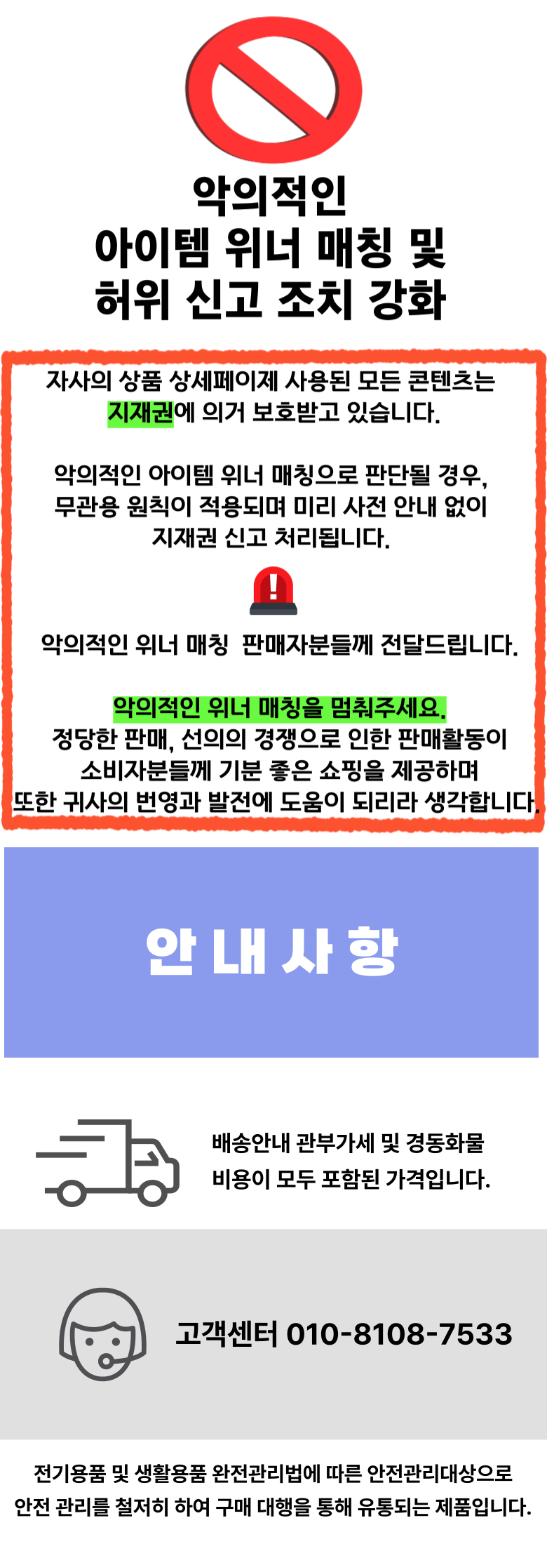 판매 부적격 상품 또는 허위과장광고 및 지식재산권을 침해하는 상품의 경우 신고하여 주시기 바랍니다.