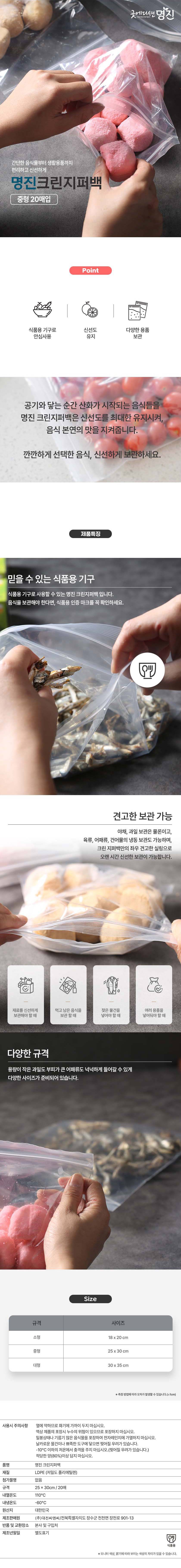 | 구성품 | 홈에디션명진 지퍼백 중(M) 20매 2개 | 크기 | 컨텐츠 참조 |