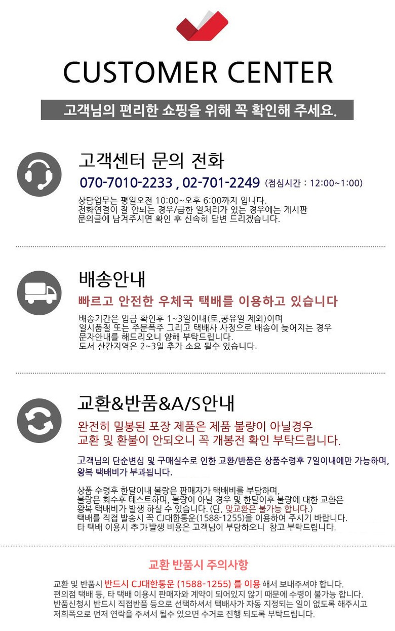 - ㆍ교환/반품에 관한 일반적인 사항은 판매자가 제시사항보다 관계법령이 우선합니다.