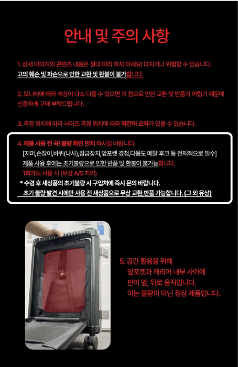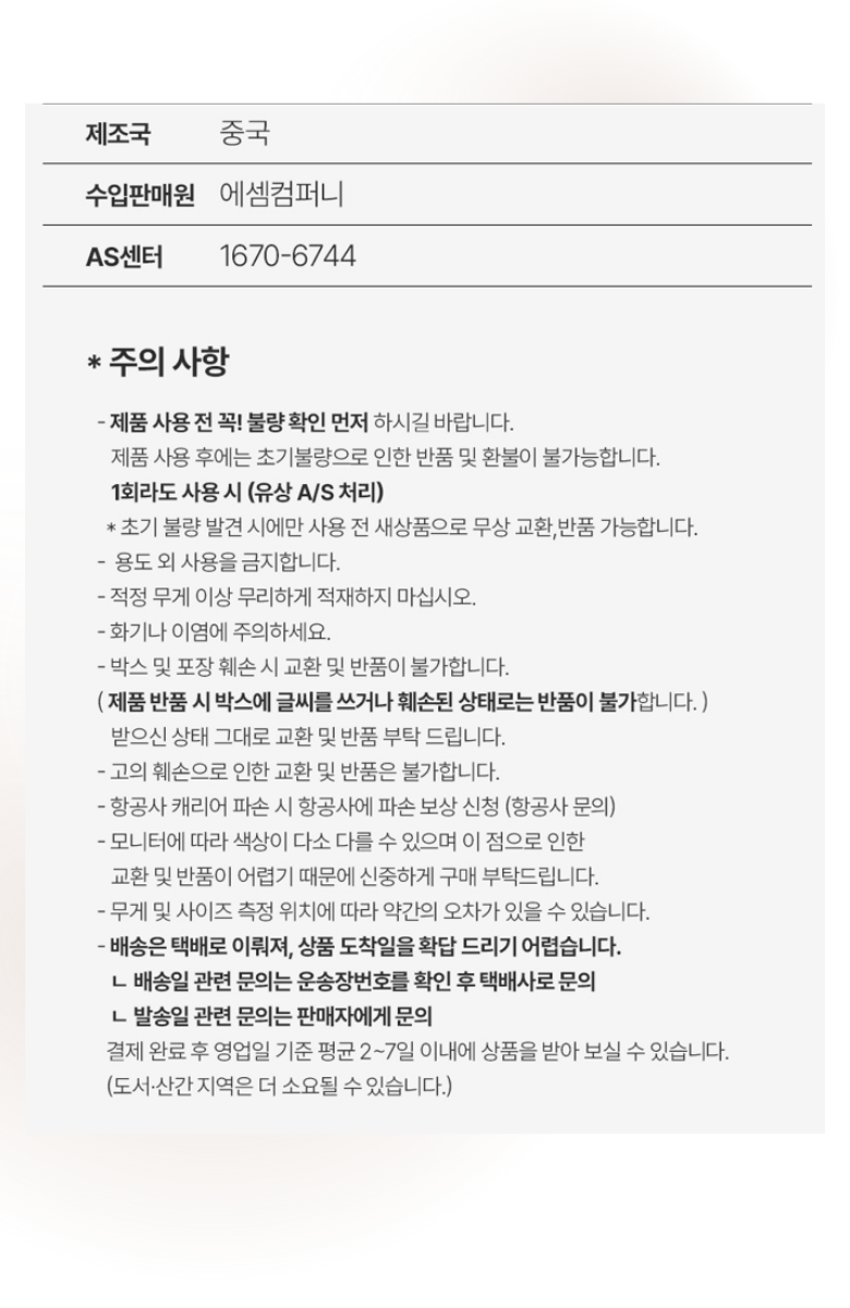 - ㆍ모니터 해상도의 차이로 인해 색상이나 이미지가 실제와 달라, 고객이 단순 변심으로 교환/반품을 무료로 요청하는 경우