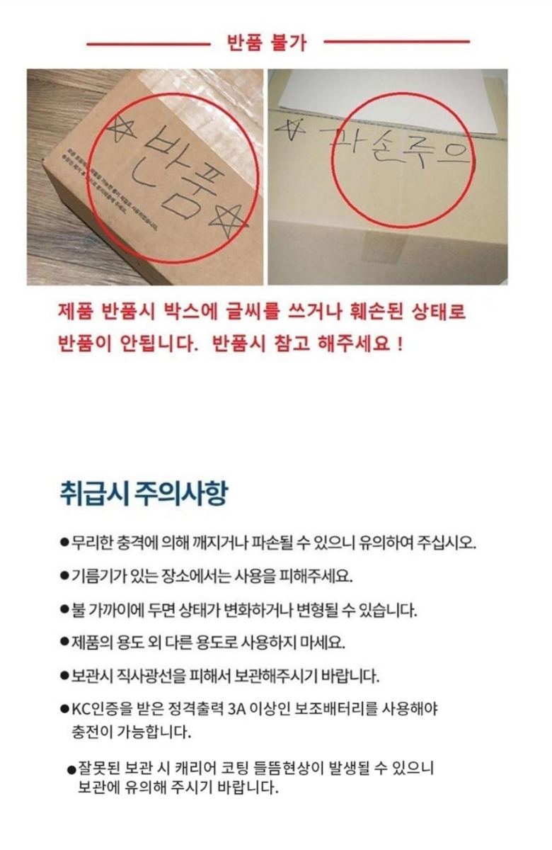 | 교환/반품 신청 기준일 | ㆍ단순변심에 의한 교환/반품은 제품 수령 후 7일 이내까지, 교환/반품 제한사항에 해당하지 않는 경우에만 가능 (배송비용과 교환/반품 비용 왕복배송비 고객부담) ㆍ상품의 내용이 표시·광고의 내용과 다른 경우에는 상품을 수령한 날부터 3개월 이내, 그 사실을 안 날 또는 알 수 있었던 날부터 |