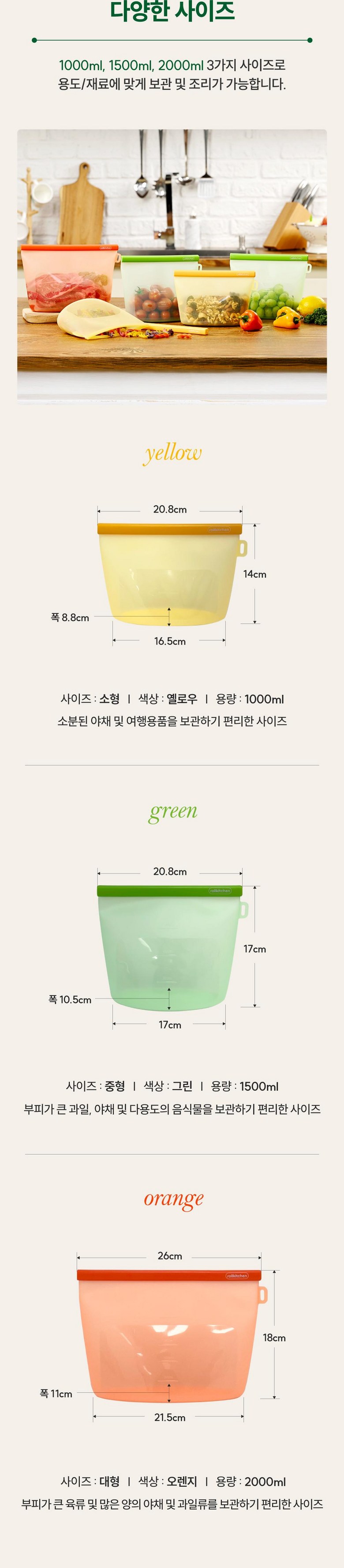 | 구성품 | 옐로우(소형,1L)2EA, 그린(중형,1.5L)2EA, 오렌지(대형,2L)1EA | 크기 | 상품 상세페이지 참조 |