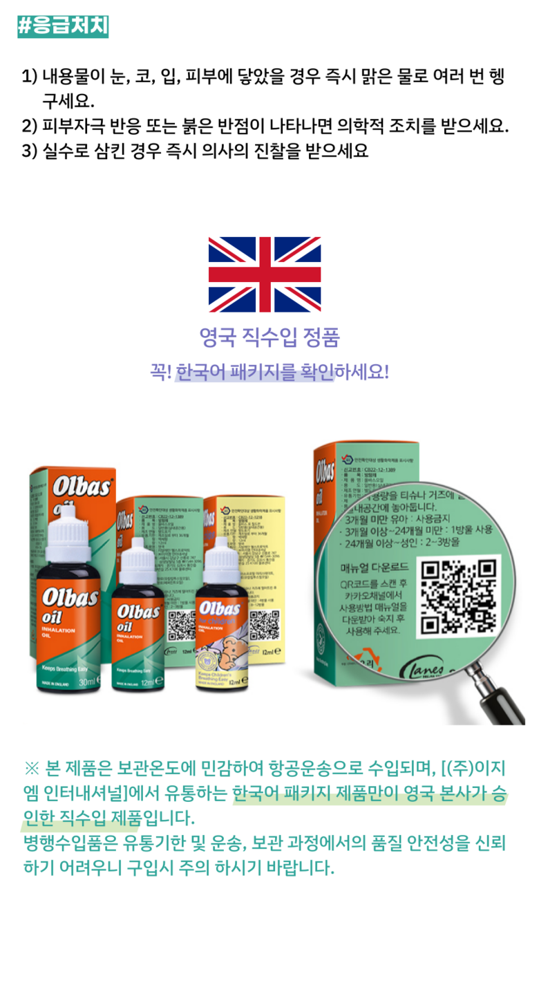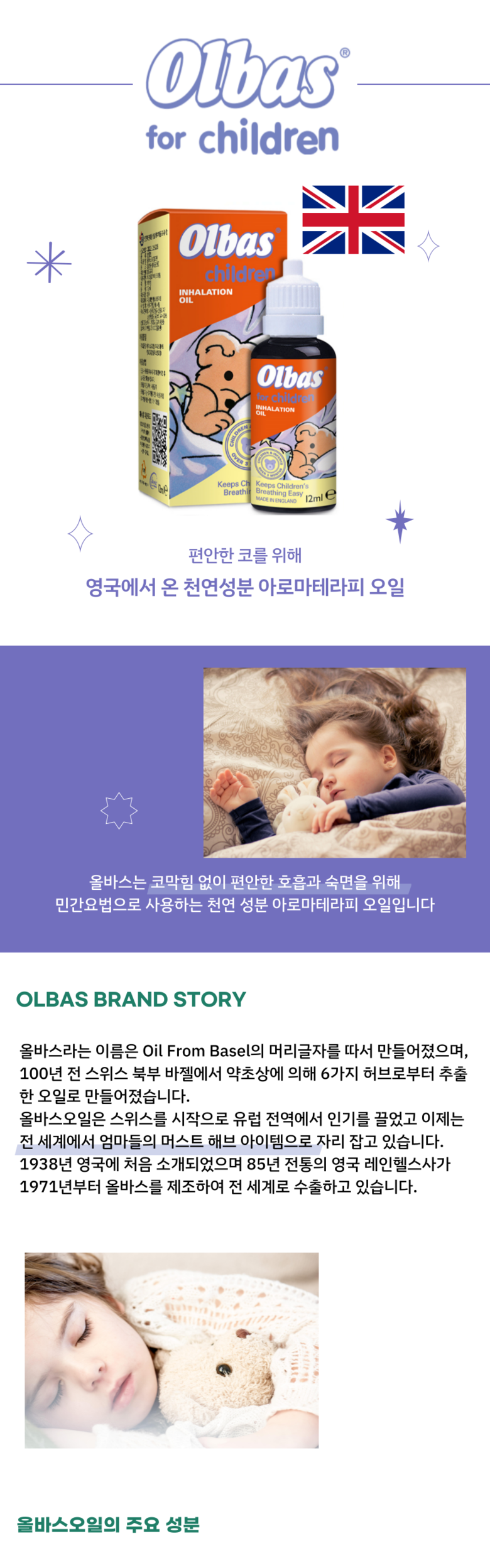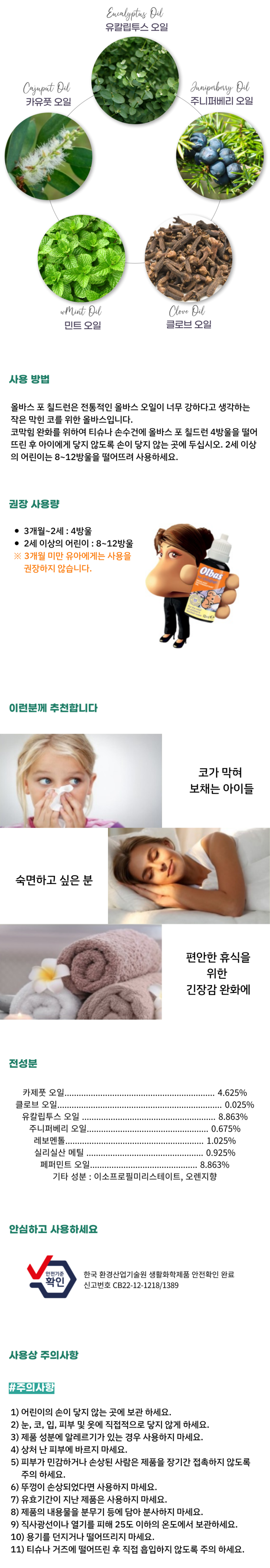 | 품목 및 제품명 | olbas children | 용도(표백제의 경우 계열을 함께표시) 및 제형 | 일반용(실내공간용) |