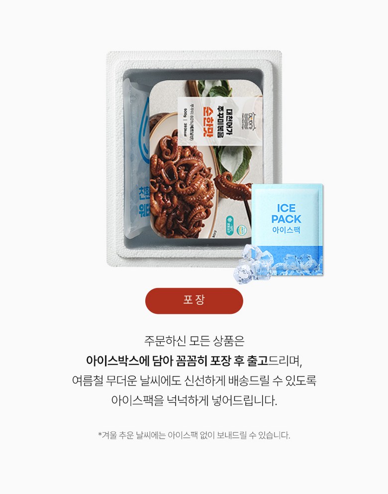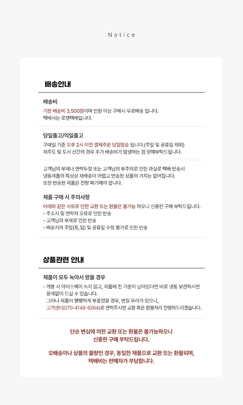 | 배송방법 | 신선/냉장/냉동 | 배송비 | 무료배송 · 도서산간 추가 배송비 - 제주 지역: 7,000원 - 도서산간 지역: 5,000원 |